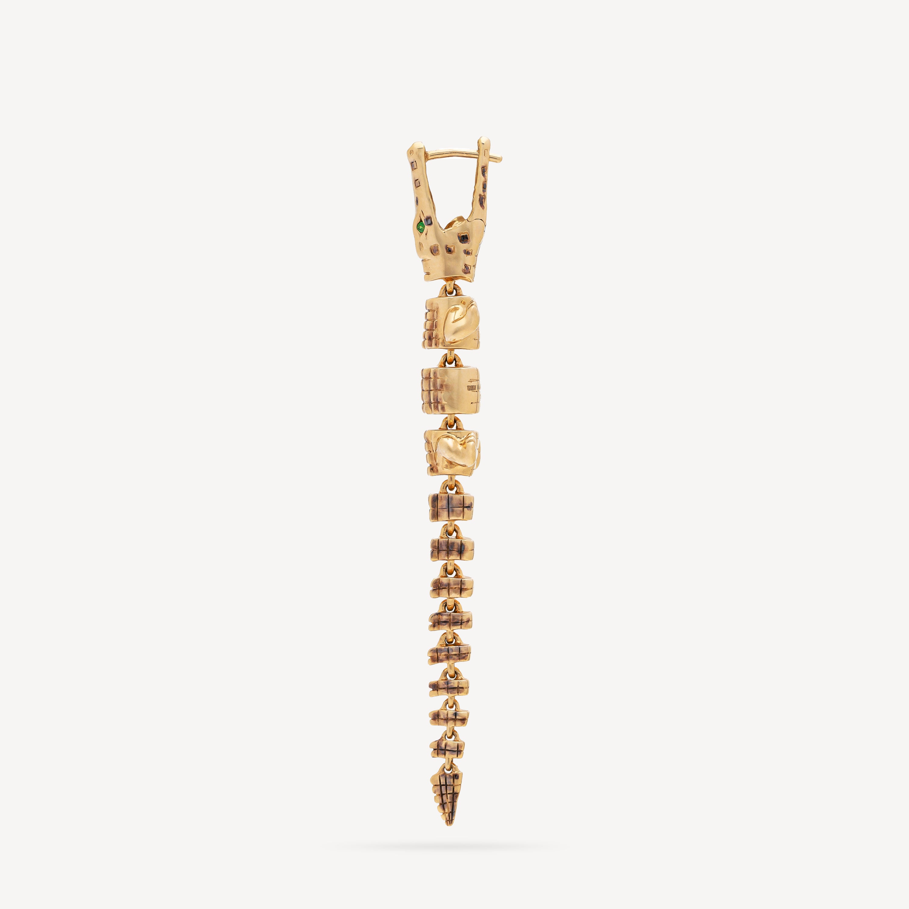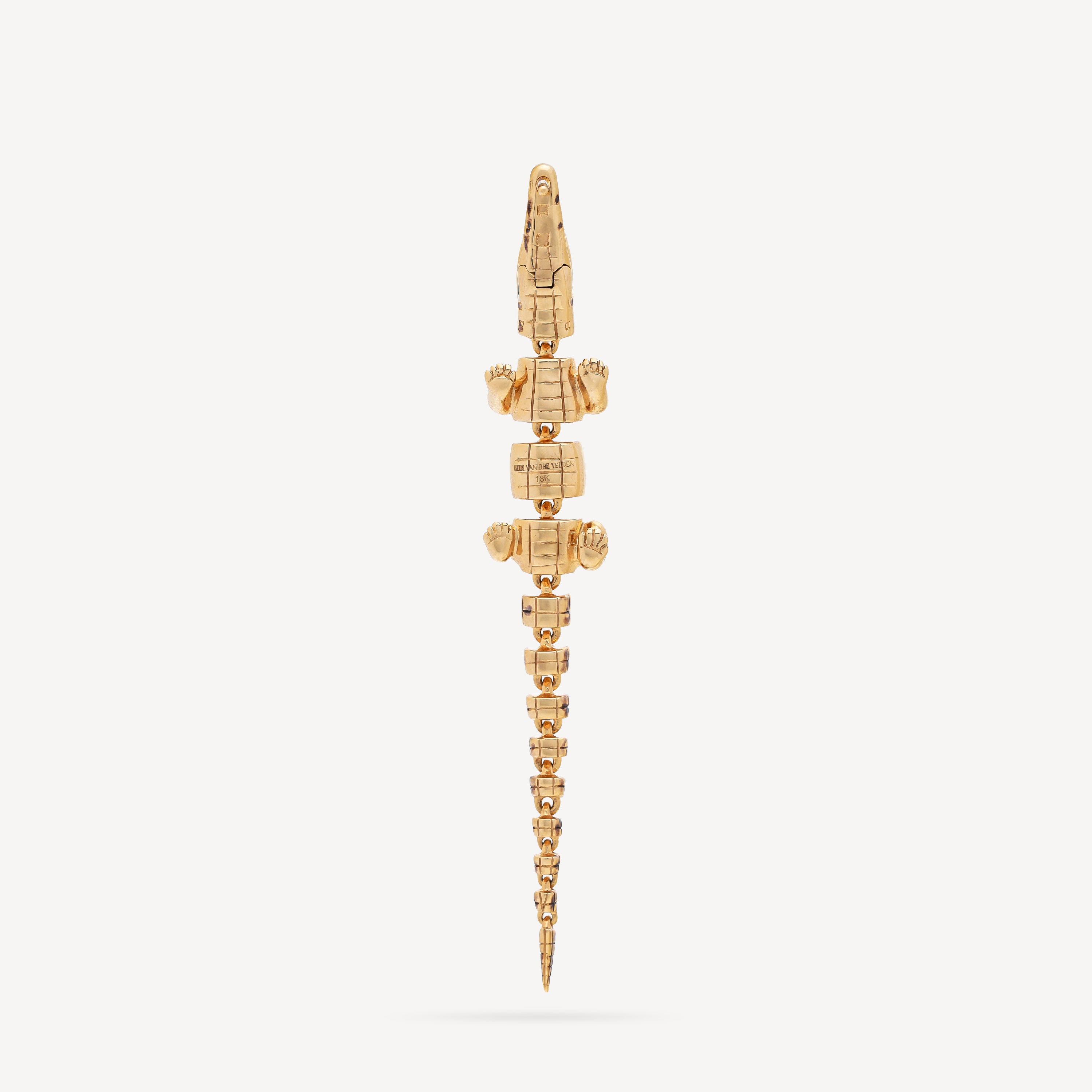 Elegant and dynamic, the Alligator Vertebrae Bite earring, crafted in 18-karat yellow gold, reflects the fluidity and structure of an alligator's spine. The earring securely fastens with a unique mechanism inspired by the powerful bite of a crocodile.