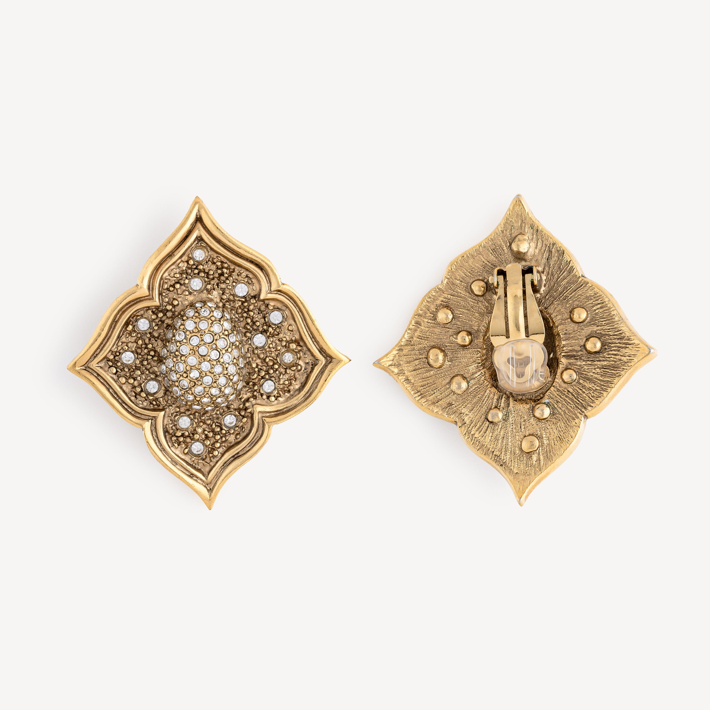 Vintage diamond flower clip-on earrings in gold-finish metal, decorated with rhinestones.