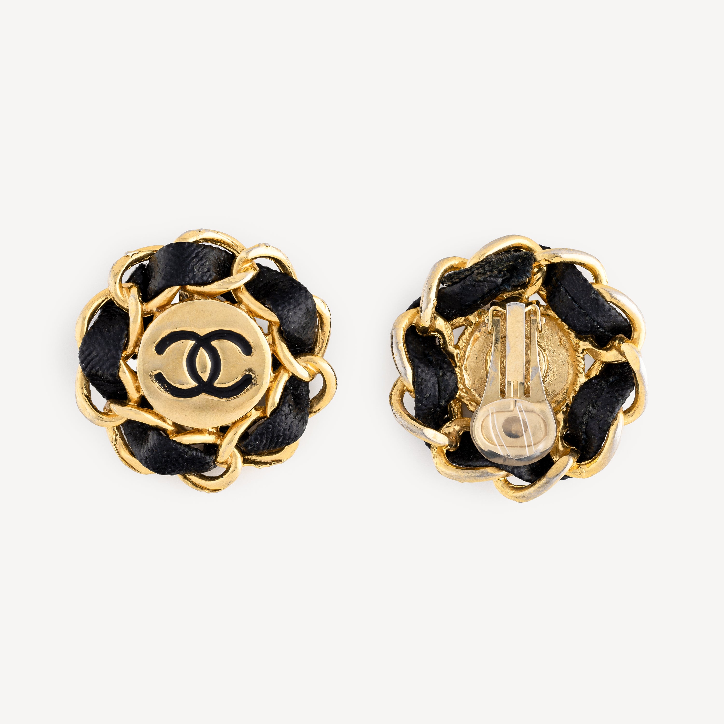 Vintage clip-on earrings in gold-finish metal and braided leather. Central Chanel logo.