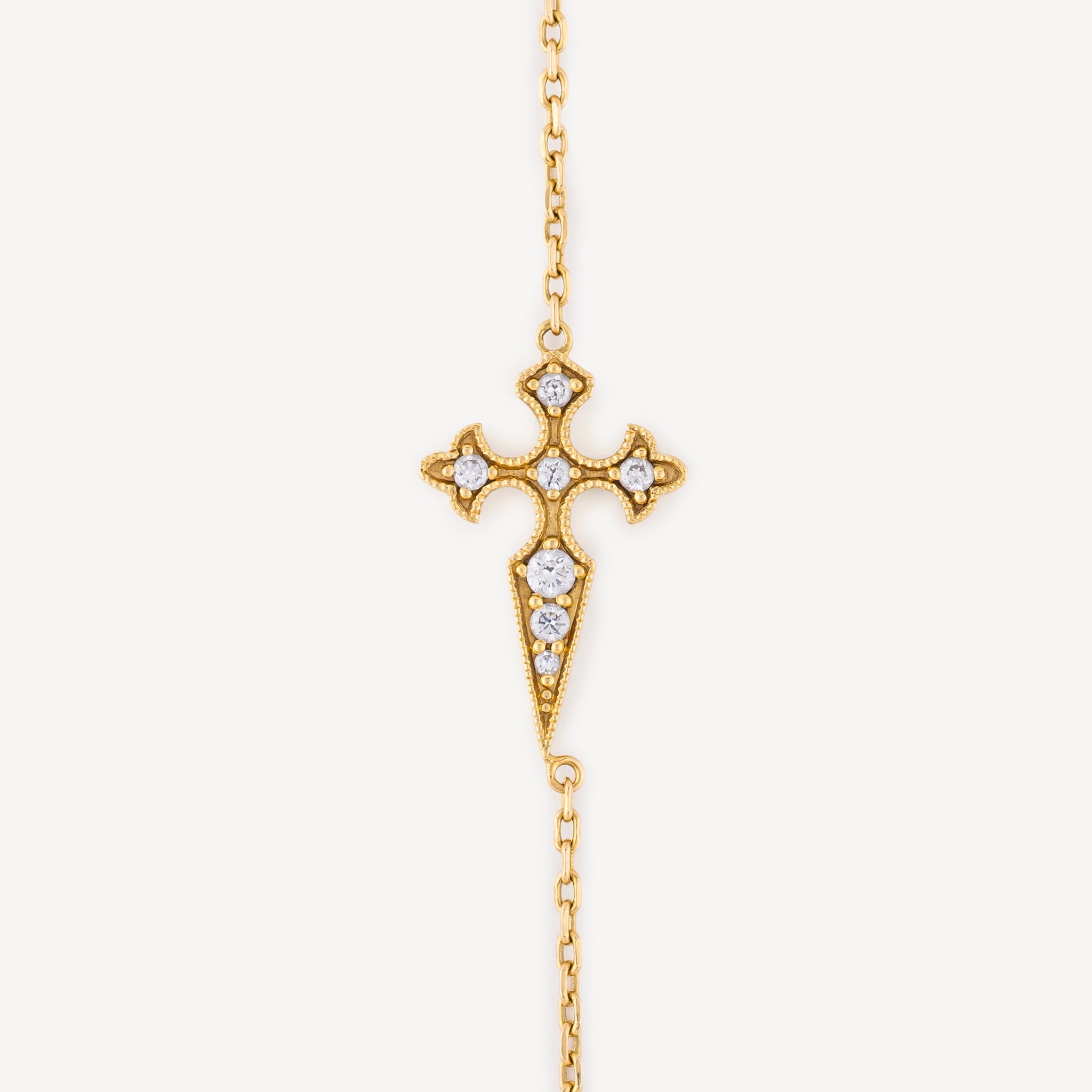 Bracelet en or jaune avec croix centrale pavée de diamants blancs. Symbole d’éternité et de pureté, le diamant illumine l’esprit, renforce la force intérieure et apporte clarté et équilibre émotionnel.