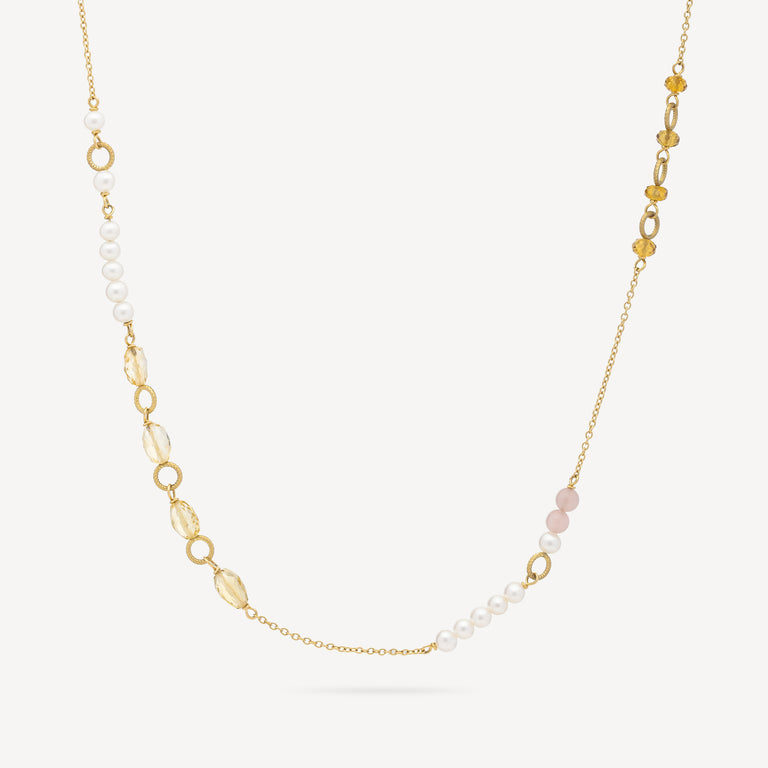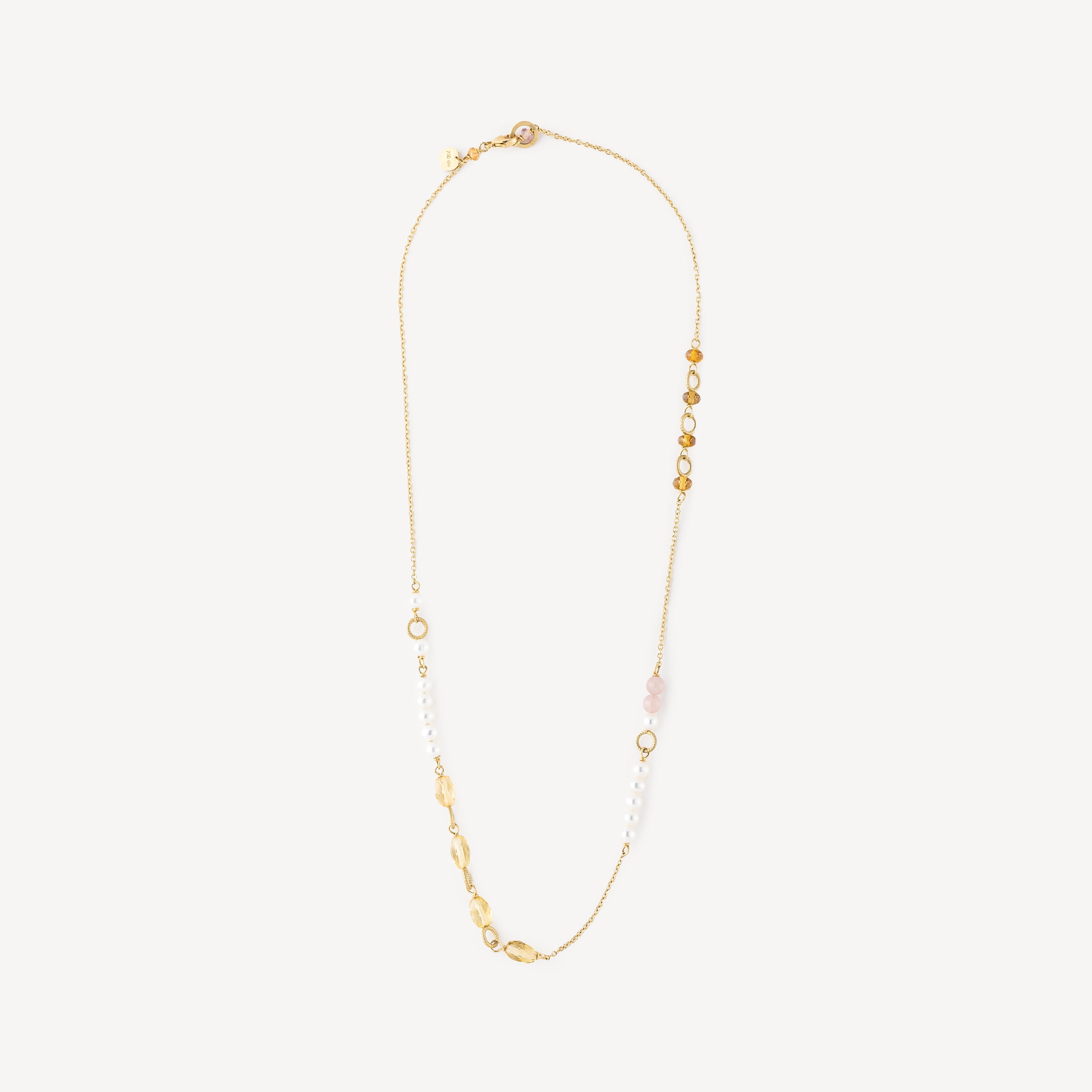 The Piccolo Mellow necklace is a modern interpretation of the classic pearl necklace. Feminine pearls combined with delicate gemstones create a romantic sensibility.