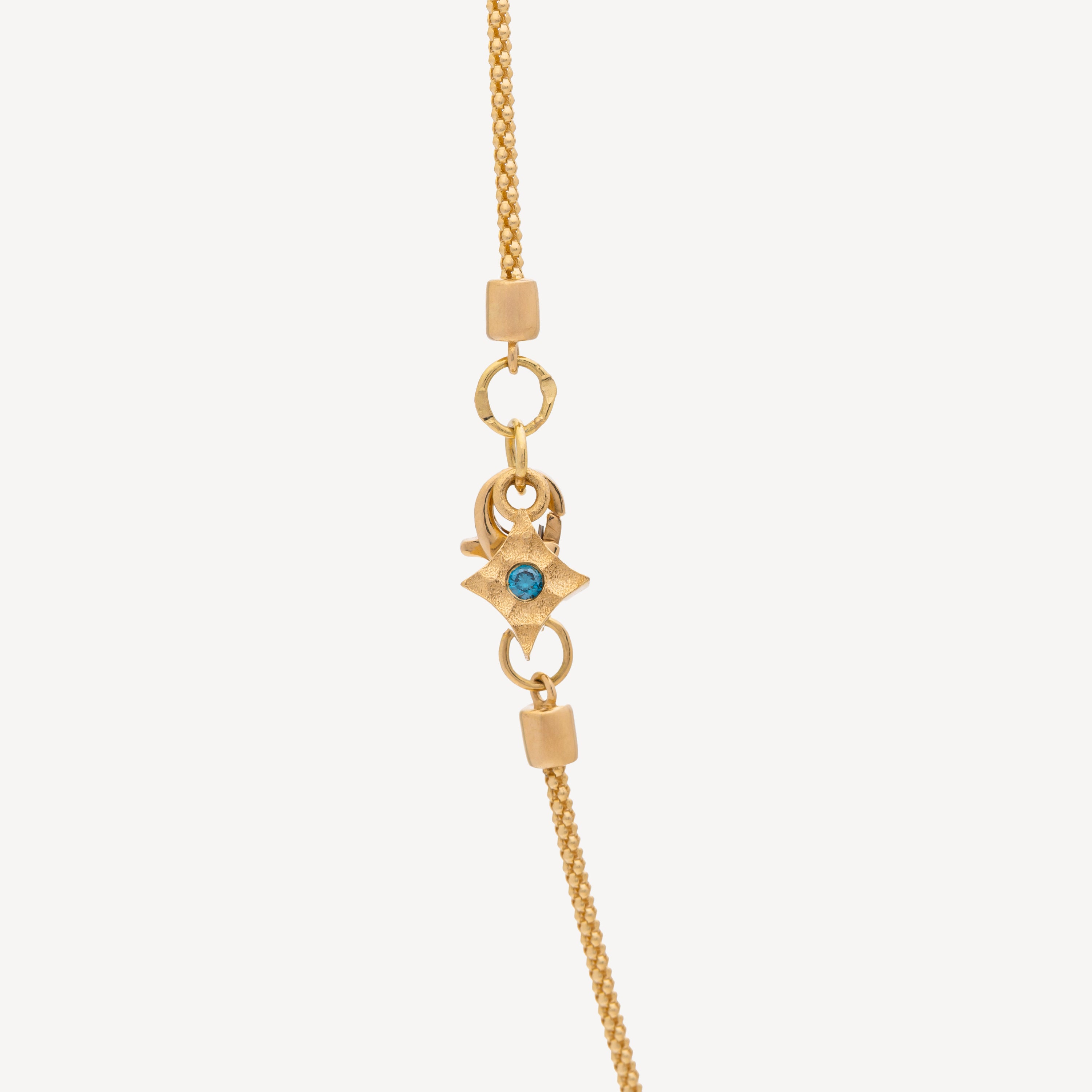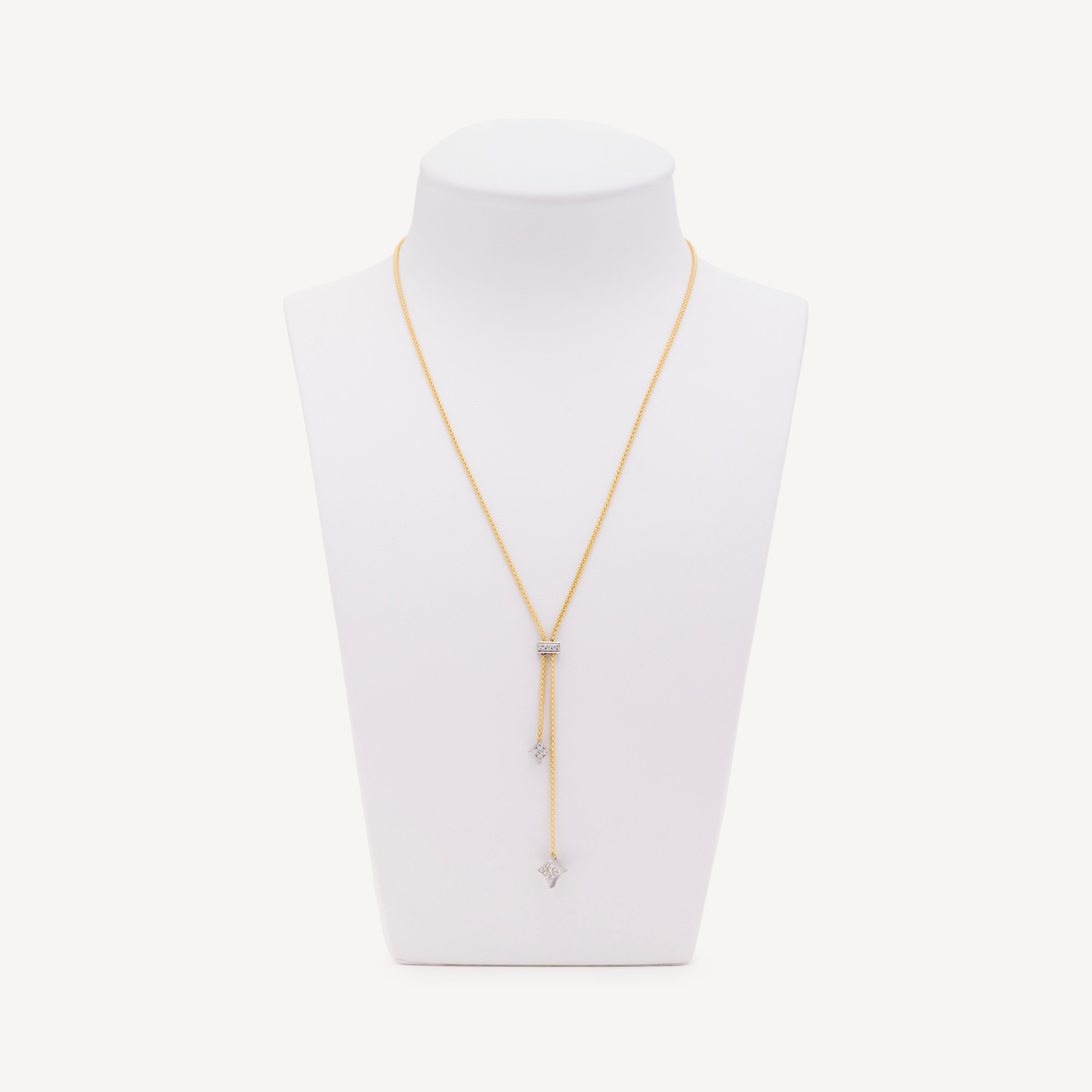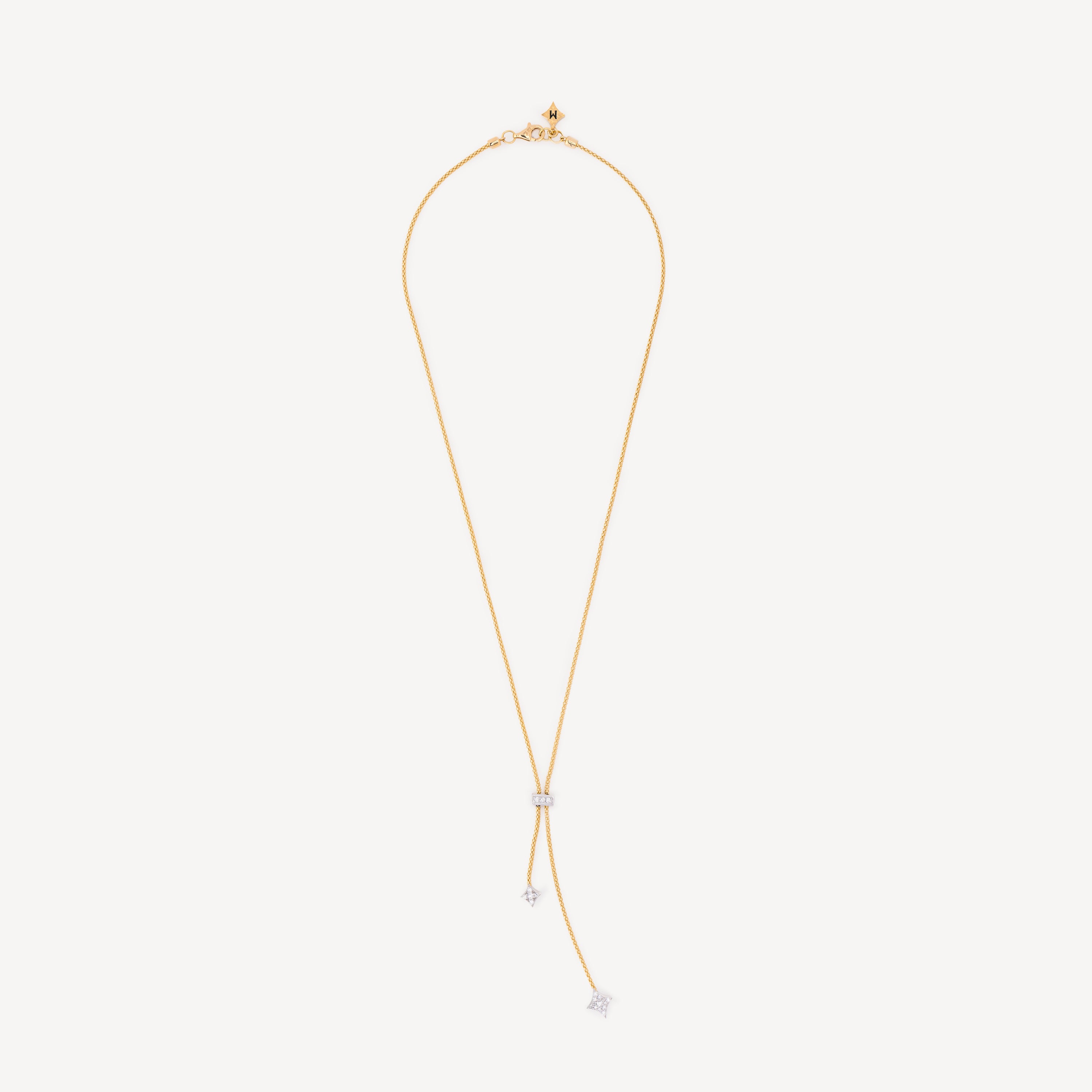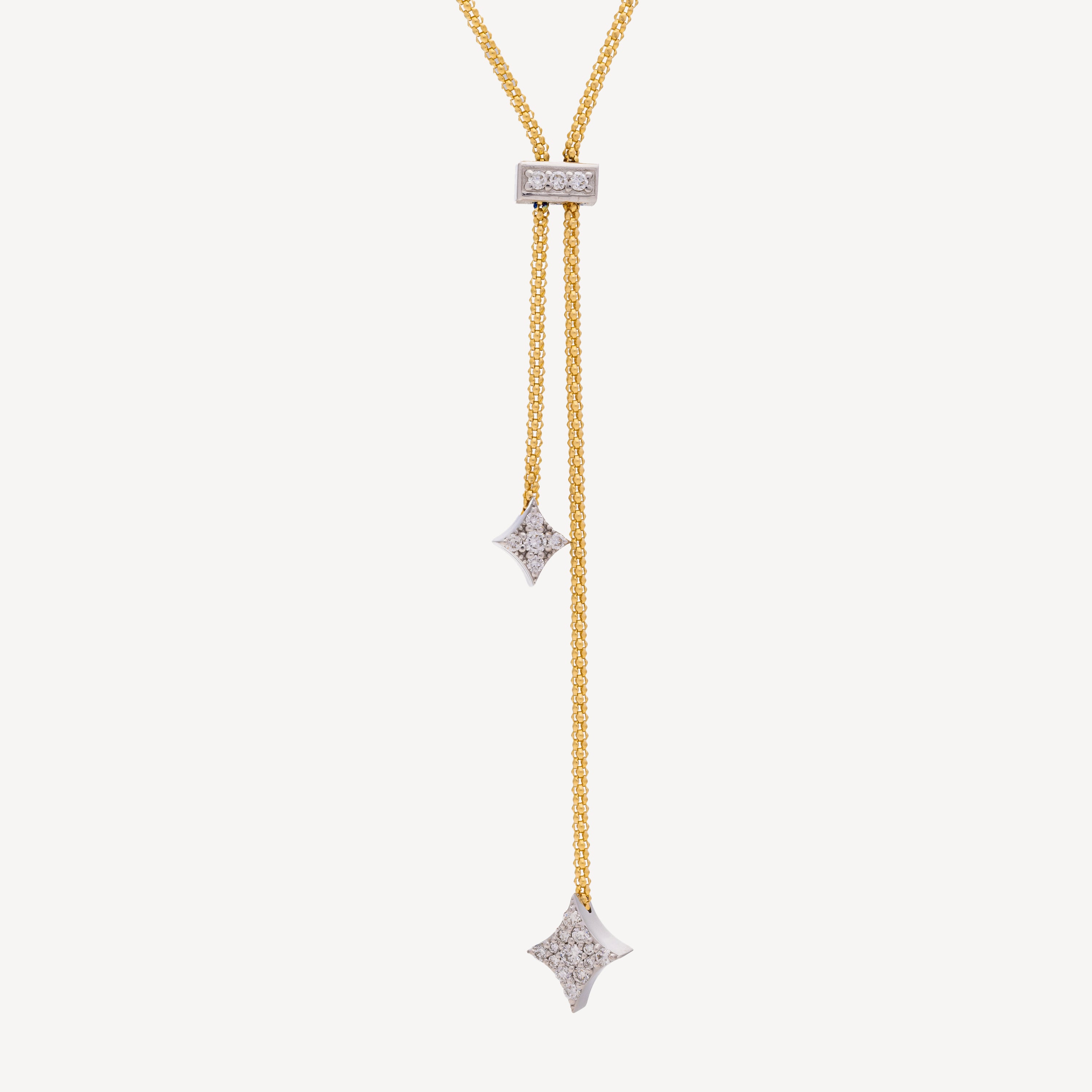 Discover an elegant and timeless piece of jewelry with The Starlight Bolo Tie necklace. Crafted in 18k white gold, this tie-style necklace features star-shaped pendants set with sparkling diamonds. The gold clasp, set with Mìrel's signature blue diamond, completes the design with a touch of understated elegance.