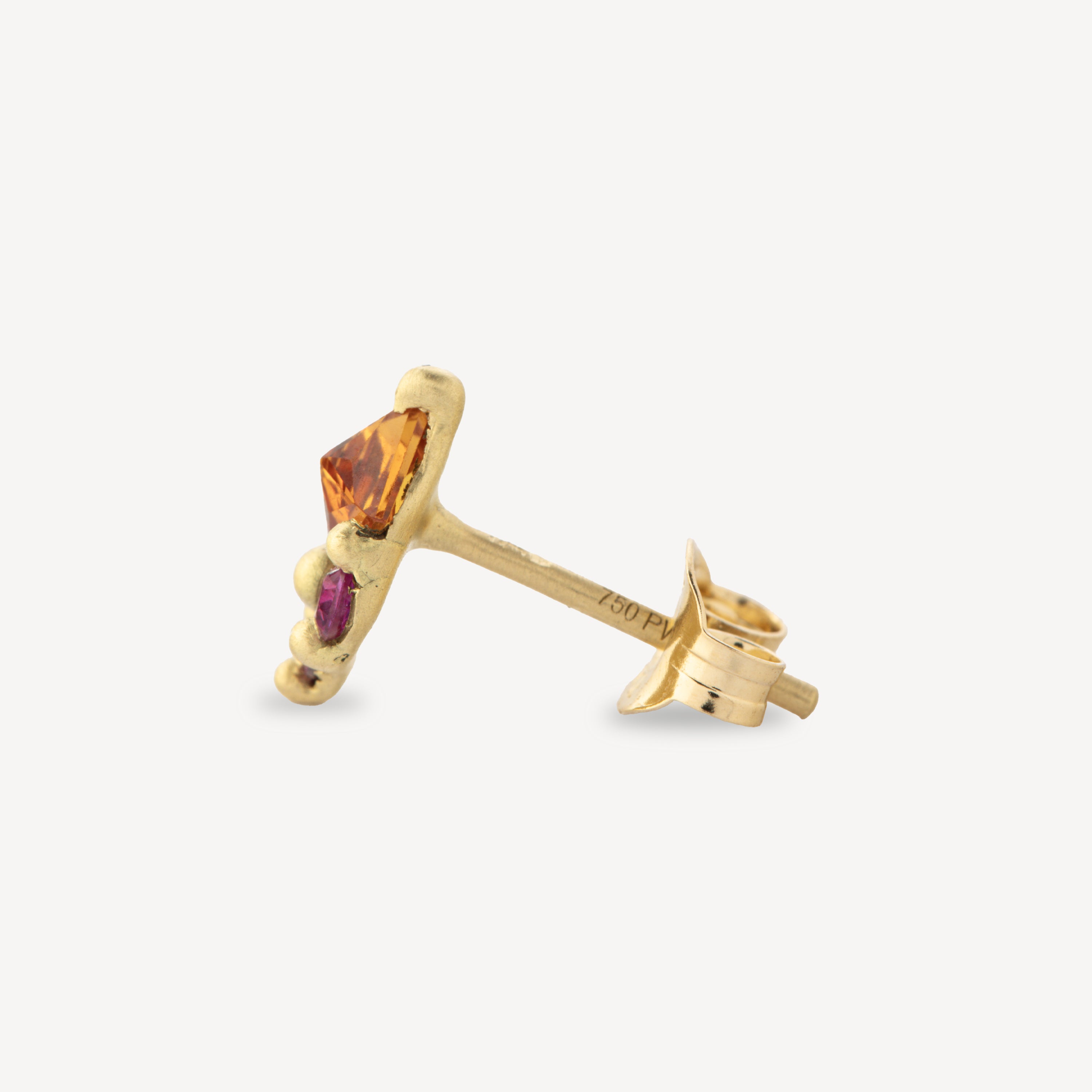 Discover the timeless elegance of this orange “Princess Cut” earring, enhanced by three round sapphires, 2 pink and 1 purple. These precious stones, delicately inlaid in a stud in the shape of subtle geometry, captivate with their brilliance and harmony. Carefully crafted, this piece of jewelry is enhanced by a butterfly clasp in recycled 18-carat yellow gold, adding a touch of refinement and authenticity to this exquisite piece.