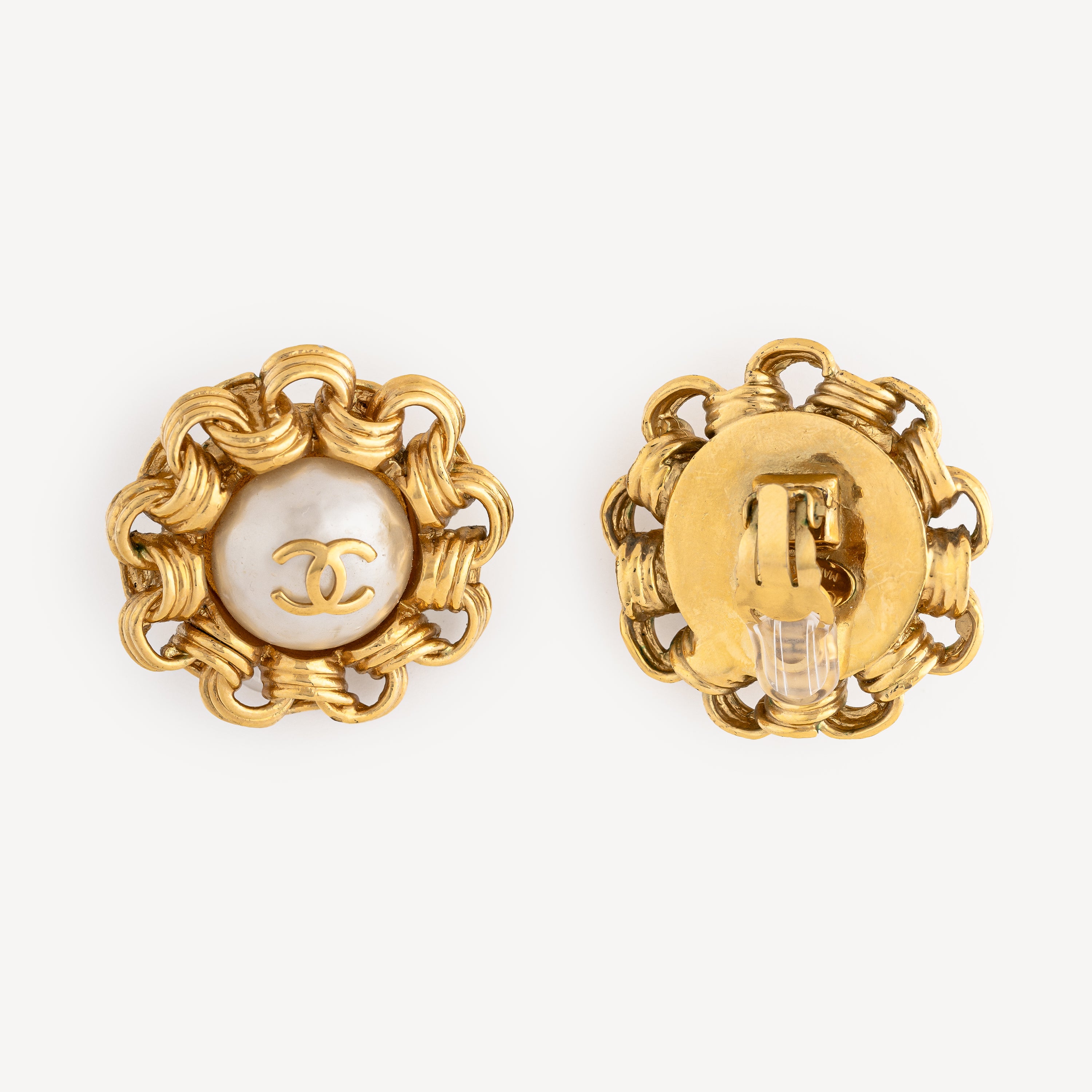 Vintage clip-on earrings in gold-finish metal with central faux pearl and Chanel logo.
