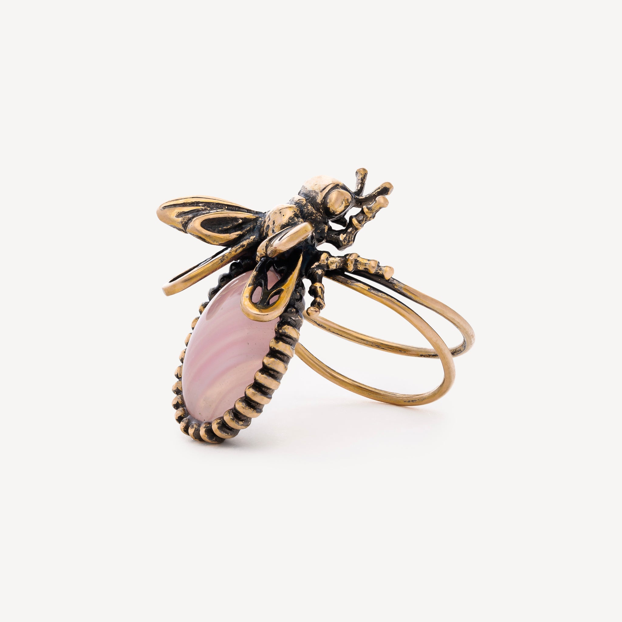 Cette bague abeille Suma Cruz est composée de laiton et argent plaquée or jaune 24 carats et est accompagnée d'un cabochon rose au centre.