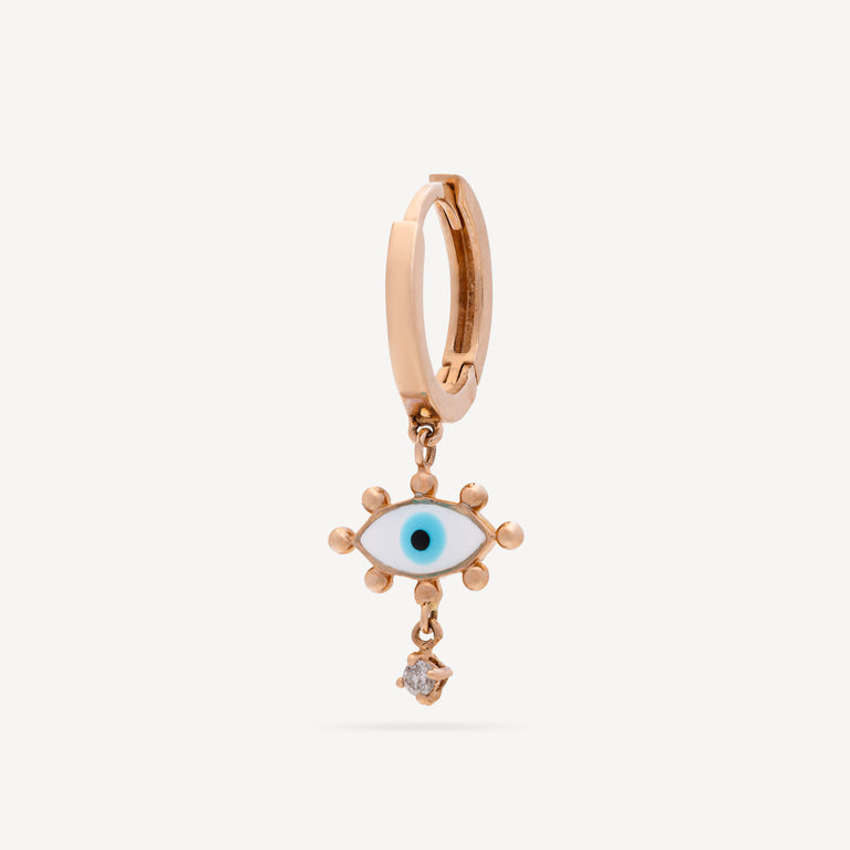 The rose gold Evil Eye earring features a white and blue enamel eye and sparkling white diamonds.