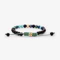 Bracelet monté sur un cordon bleu composé de 29 beads de 6mm et un lock : 1 bead en or jaune avec diamants blancs, 3 beads en saphir bleu, 3 beads en émeraude, 4 beads en turquoise, 18 beads en ébène, et 1 lock en or jaune avec un diamant blanc.