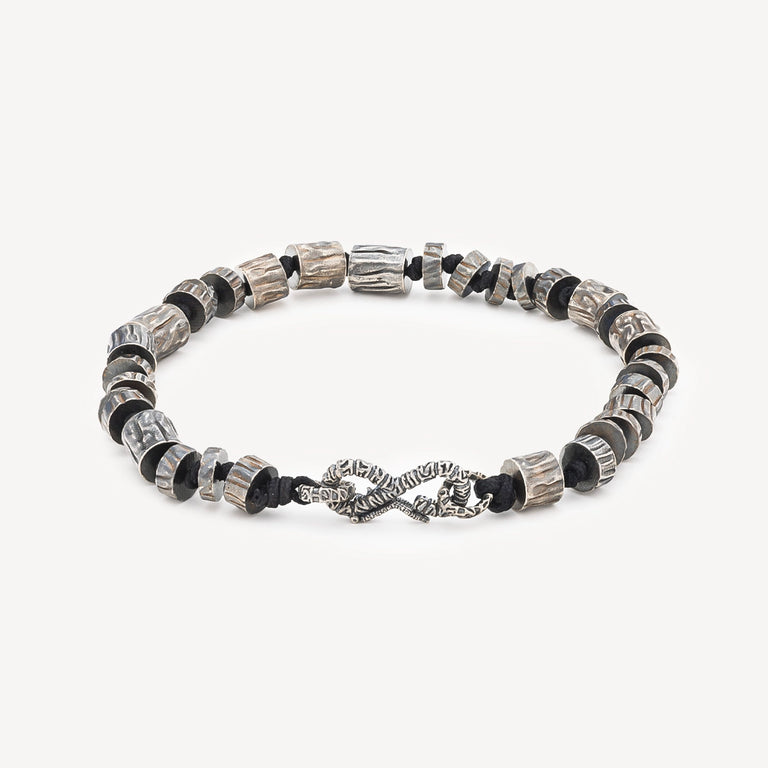 This Infiny Bel Air bracelet from the Los Angeles collection perfectly embodies the Mad Lords aesthetic. On a deep black cord reminiscent of a Californian night and the rebellious spirit of Los Angeles, sterling silver beads add a subtle, organic glow, like luminous notes in an urban twilight. The silver infinity clasp becomes more than just a detail; it symbolizes an attitude that transcends trends and conventions. Both understated and charismatic, this bracelet is designed for those who wear their jewelry as a personal signature, almost a talisman of character.