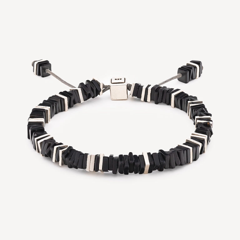 Bracelet signed M Cohen with square onyx and silver beads mounted on a grey cord.