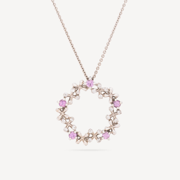 Le collier Wildflowers Mini Saphir signé Faiith Jewels s’inscrit dans une idée de cercle, comme une couronne florale suspendue au creux du cou. Tout part d’un motif végétal, où diamants et saphirs roses se répondent, dans une composition presque organique. Les diamants blancs viennent capter la lumière par touches fines, tandis que les saphirs roses apportent une vibration plus chaude. Le tout est monté en or blanc, dans une écriture délicate. Il se pose naturellement sur la peau, comme un talisman contemporain, un peu sauvage, et profondément incarné.