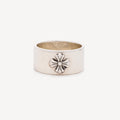 La bague Floral Chopper Iron Cross Band en argent présente un large anneau sur lequel se tient une fleur de Lys centrale.