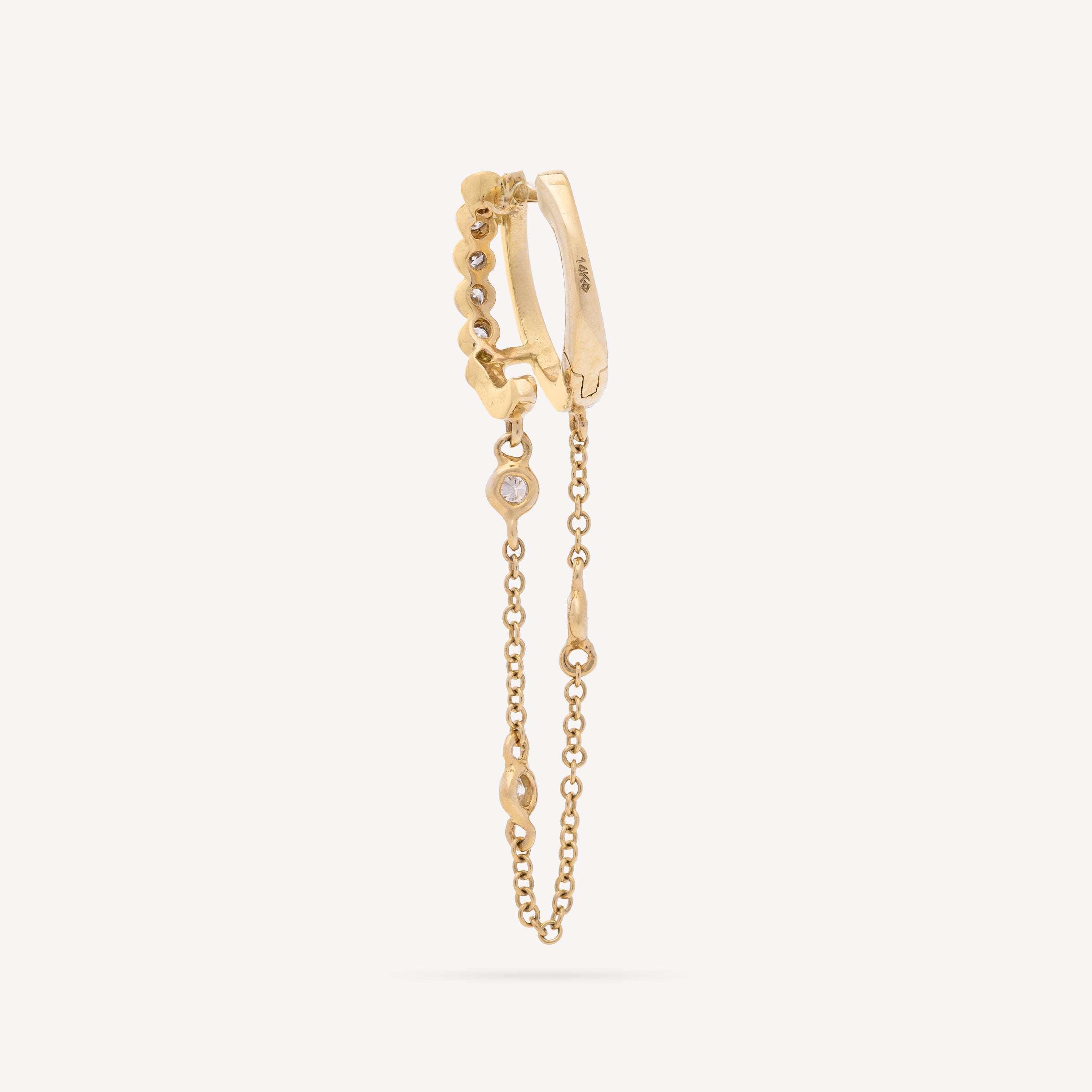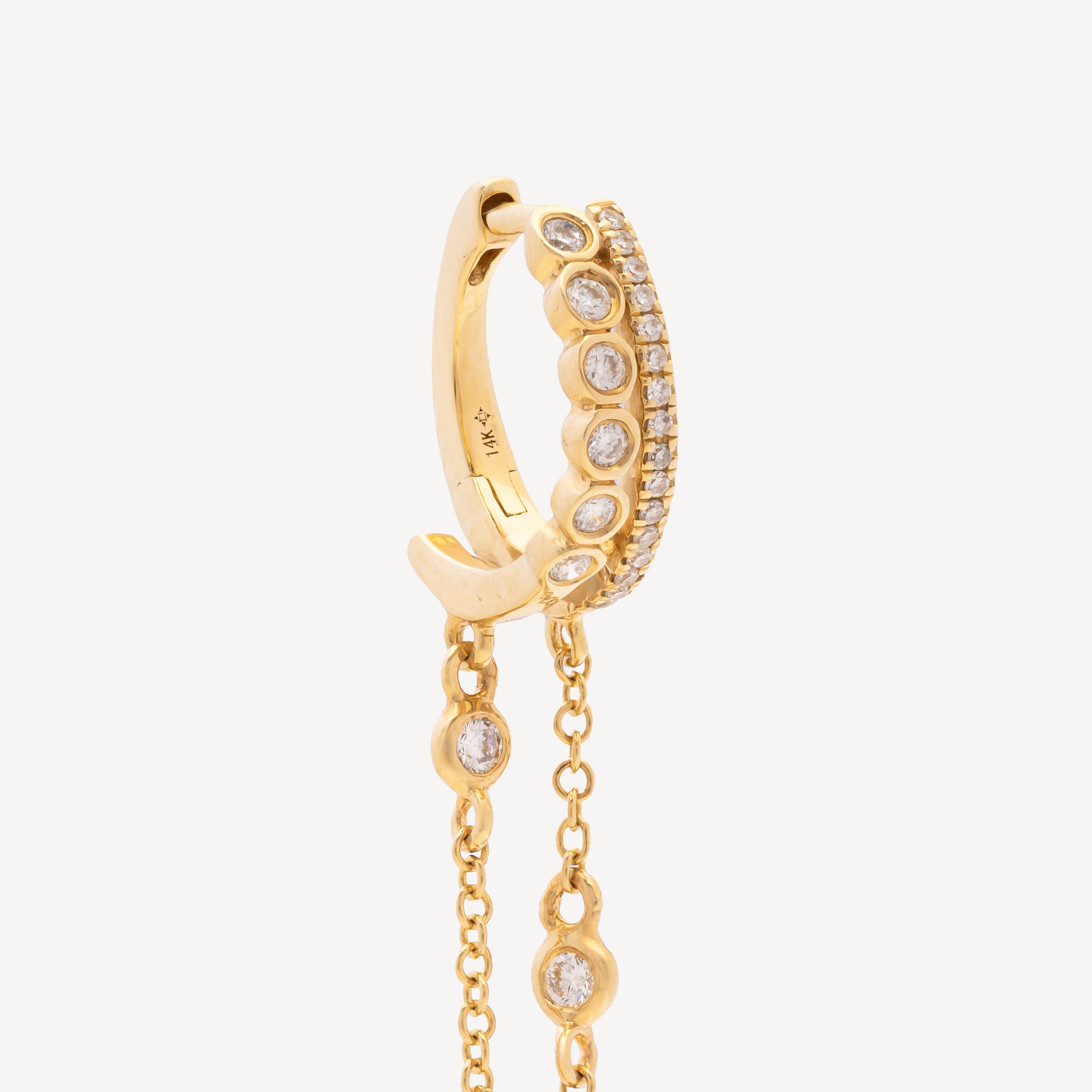 Boucles d'oreilles en or jaune 14ct ornées d'une chaîne faisant flotter trois diamants blancs.