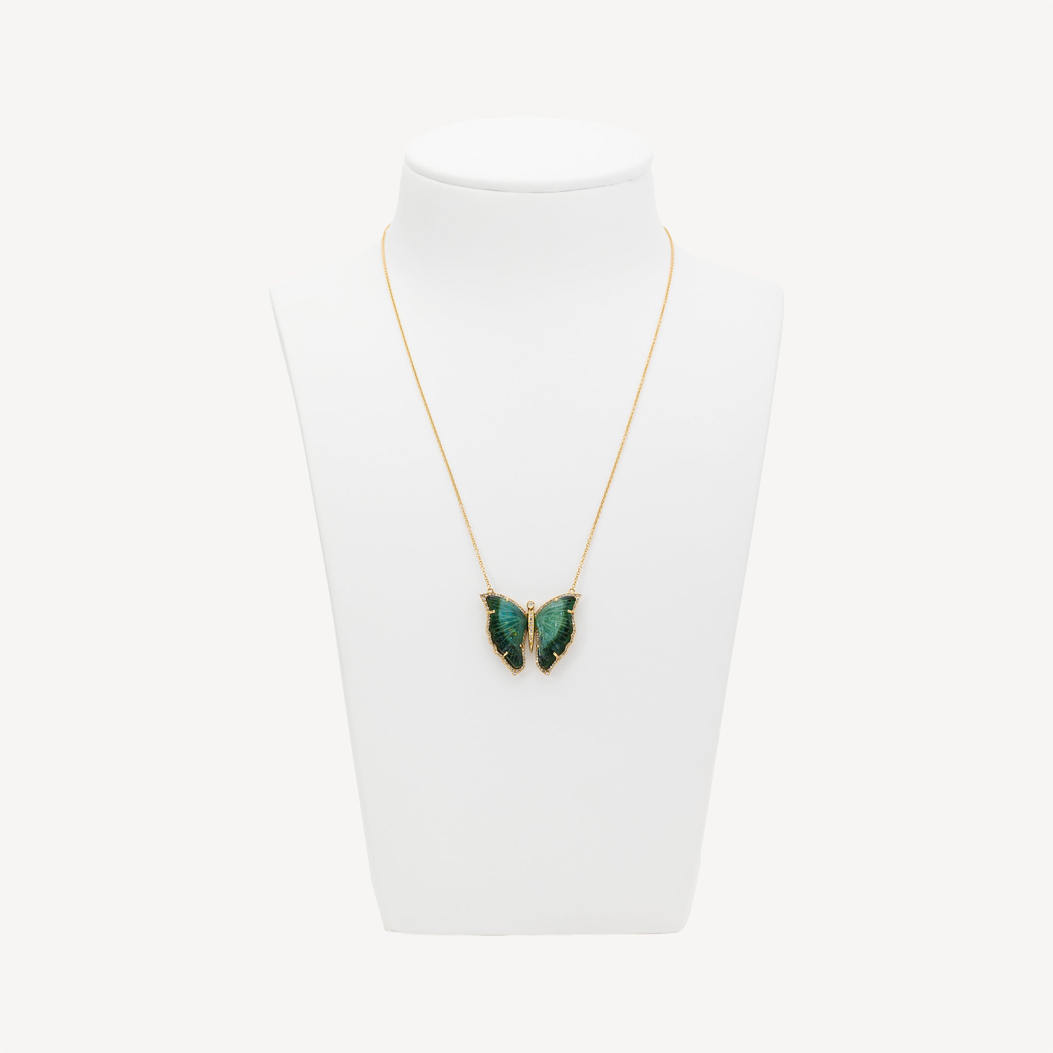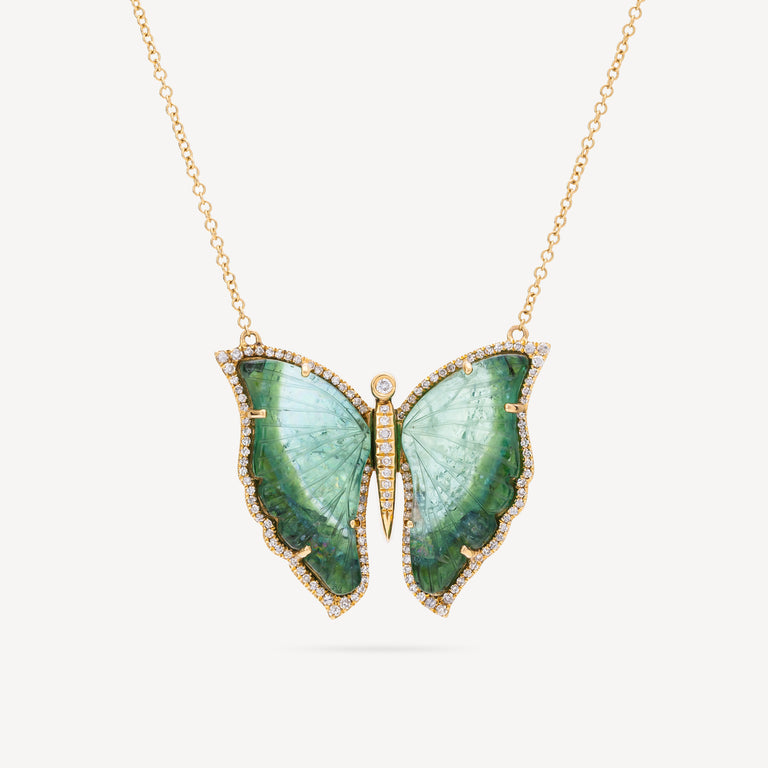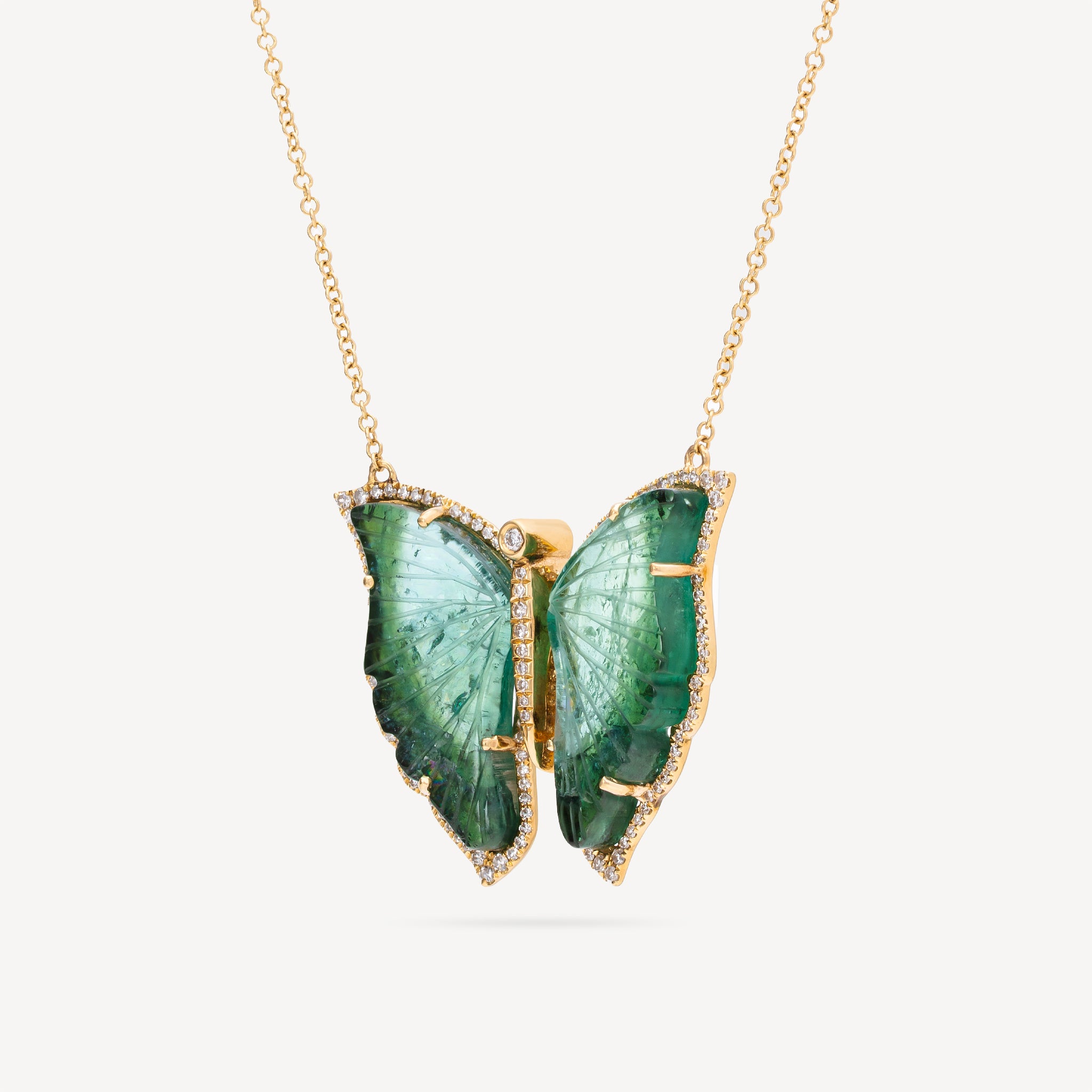 Le collier Lumière Butterfly en or 14 carats est serti de diamants et orné d’ailes sculptées dans une pierre tourmaline. Les qualités électriques de la tourmaline lui confèrent un rôle de bouclier protecteur.