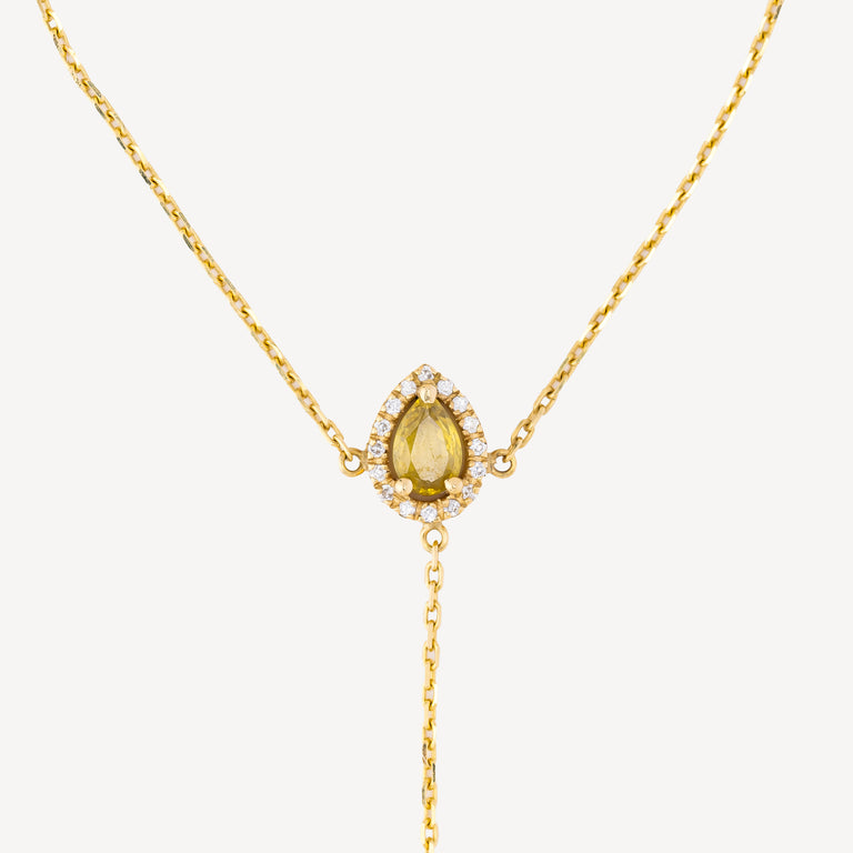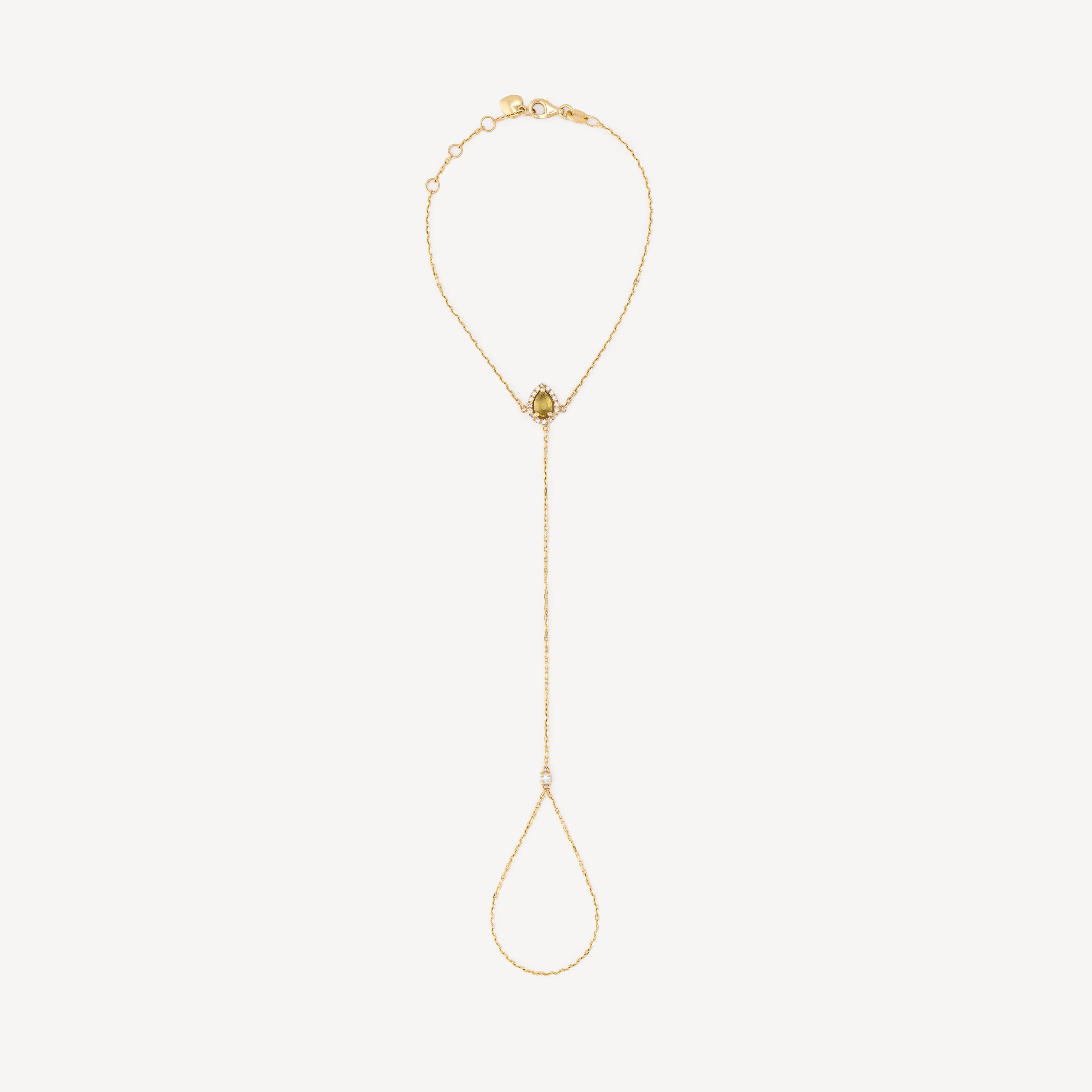 Ce magnifique bracelet de main en or jaune 18ct présente un saphir jaune taillé en poire au centre et entouré de diamants blancs.