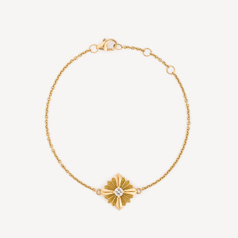 Le bracelet Stamp est en or jaune poli et met en valeur un diamant central. Le motif Stamp est comme une empreinte qui se répète et se démultiplie, rappelant les multitudes de tampons de passeport aux couleurs et formes bariolées. Le diamant élève les énergies, renforce la clarté mentale et la force intérieure.