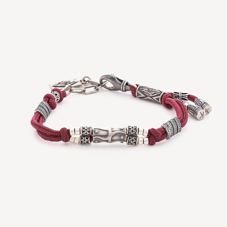 Découvrez le Bracelet Simha de la Maison Kameart. Le cordage rouge, naturel, s’orne de perles en argent finement travaillées, captant la lumière avec douceur. Porté au poignet, ce bijou évoque un lien précieux, intime et sincère.