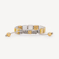 Bracelet monté sur un cordon gris composé de : 9 locks en nacre double face jaune et blanche, 2 locks en or jaune pavés de diamants blancs, un lock en or jaune orné d’un diamant blanc, et 2 beads en or jaune ornées de diamants blancs.