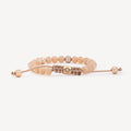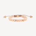 Bracelet monté sur un cordon rose composé de 26 beads et 1 lock : 22 beads en quartz rose, 3 beads en or rose serties de 2 diamants, 1 lock en or rose serti d’un diamant et 1 bead en rose pavée de diamants.