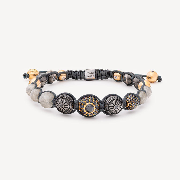 Bracelet monté sur un cordon gris composé de 20 beads : 6 beads or jaune ornées de diamants blancs, 1 lock en or blanc orné d’un diamant blanc, 6 beads en or noir ornées de diamants noirs, 1 bead en or jaune pavée de diamants noirs, 1 bead en or jaune pavée de diamants noirs avec un diamant noir central, 5 beads en diamant facetté.