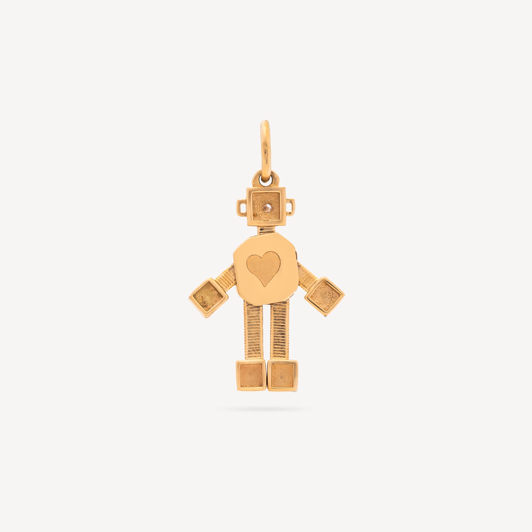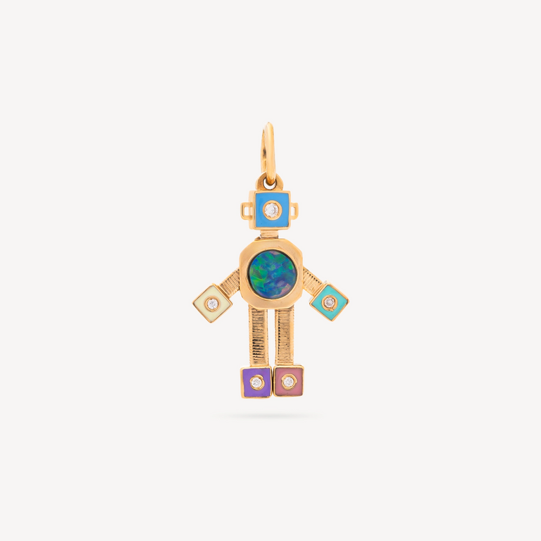 Le pendentif articulé Van Robot Mini joue avec les codes de la haute joaillerie et de la fantaisie. Confectionné à la main en Italie, il mêle l’éclat du diamant, la magie changeante de l’opale australienne et la profondeur de l’émail, le tout serti dans l'or jaune. Véritable totem pop et précieux, il se porte seul ou en accumulation, comme un compagnon chargé d’énergie. L’opale stimule la créativité et la joie, tandis que le diamant élève la clarté et la confiance en soit.