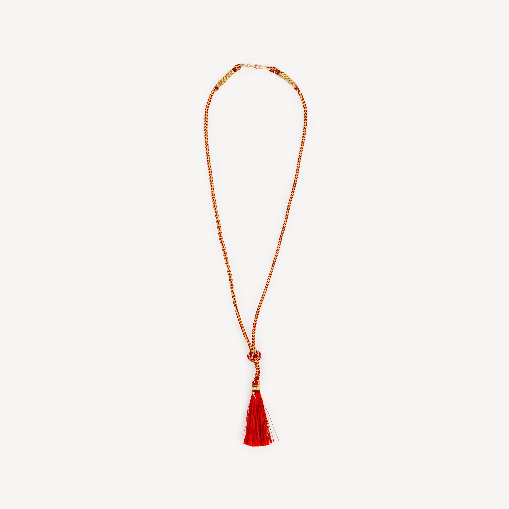 Collier lien rouge et doré avec pendentif pompom et fermoir menotte en or jaune.