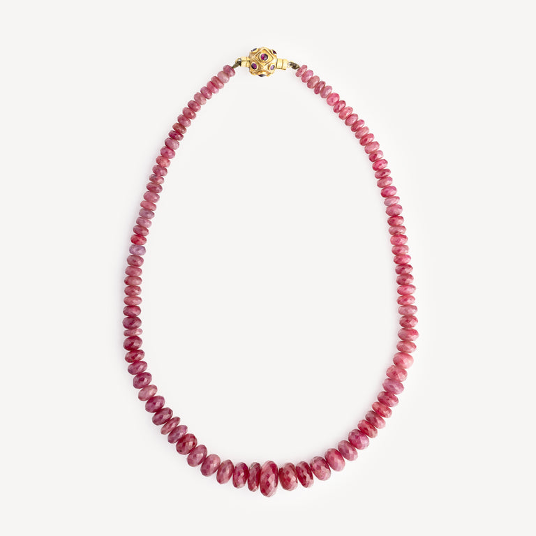 Collier rivière de rubis facettés avec fermoir en or serti de petits rubis.