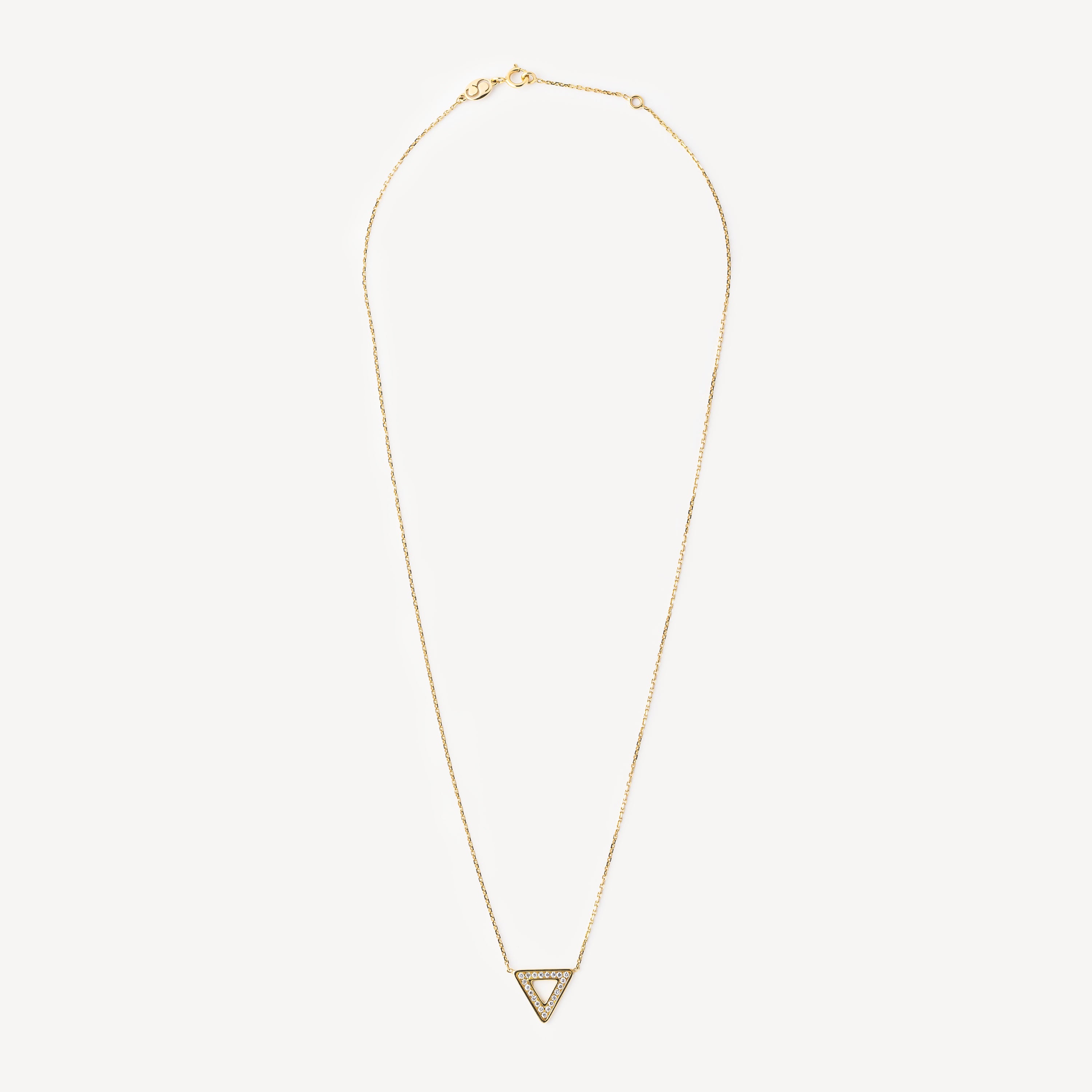 Collier en or jaune avec pendentif triangle orné de diamants blancs.