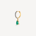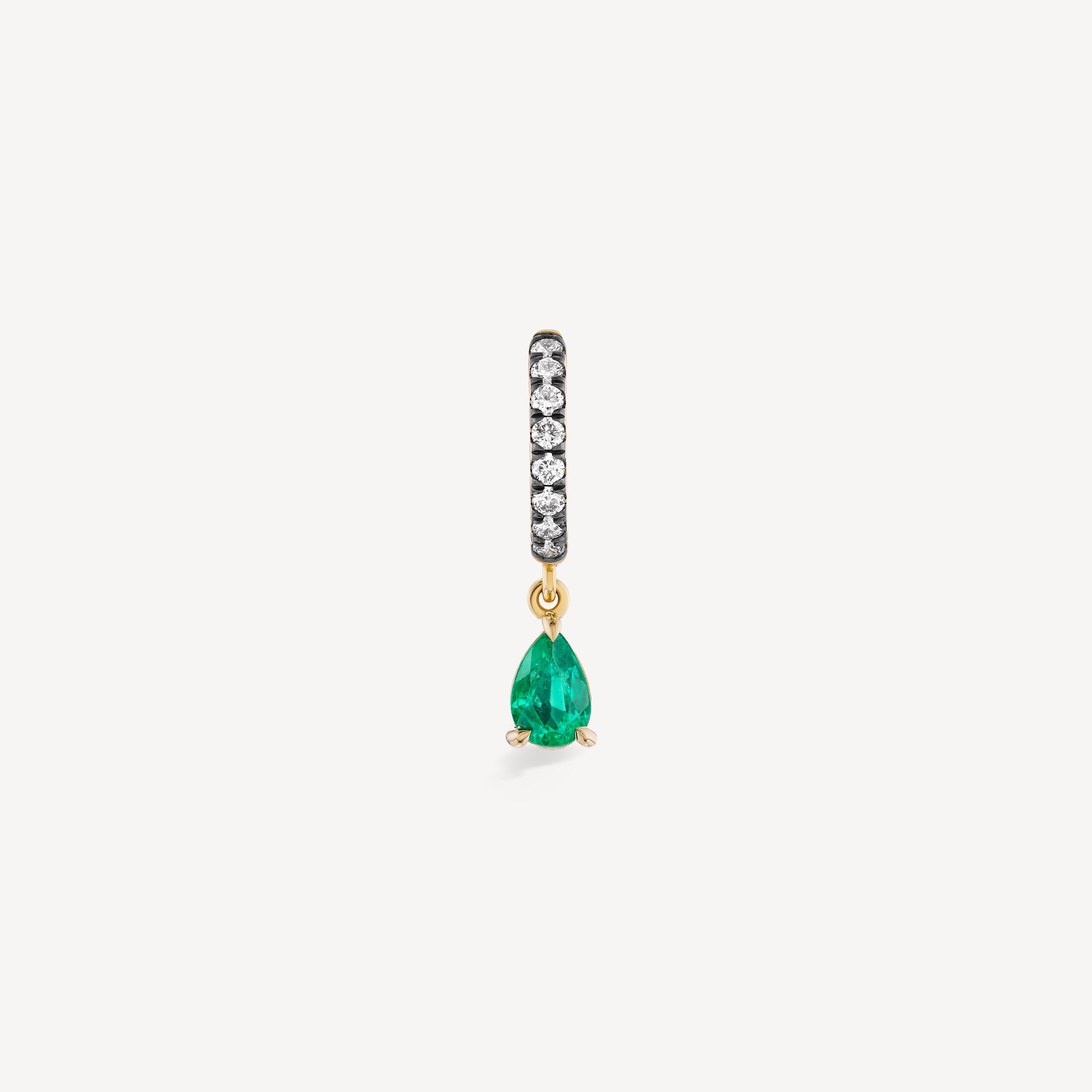 Fiametta présente cette petite créole pavée de diamants blancs à la finition subtilement patinée, sublimée par des émeraudes poire venues du Brésil. En or jaune, elle se porte seule ou s’empile pour créer un style personnalisé et raffiné. L’émeraude favorise l’harmonie, l’équilibre émotionnel et la clarté du cœur.