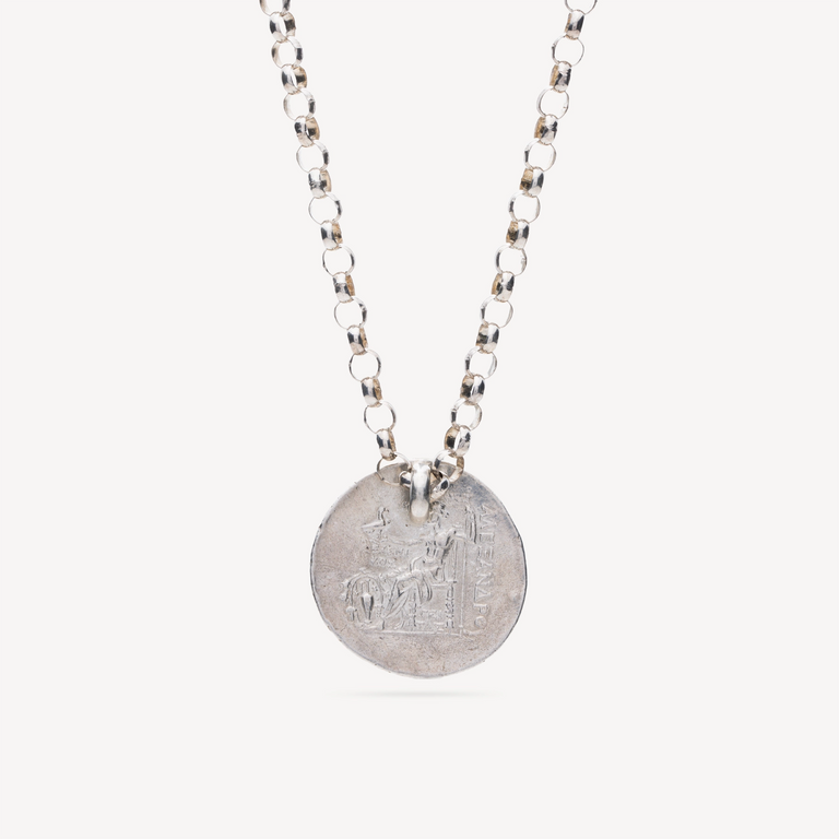 Le pendentif signé Florence Lanzmann est constitué d’un tétradrachme en argent d’Alexandre le Grand tandis qu’au revers apparaît Athéna, déesse de la guerre et de la sagesse. Cette pièce évoque la Thrace entre 306 et 282 av. J.-C, et incarne à la fois l’histoire, la puissance et le prestige d’Alexandre le Grand dans un bijou unique et chargé de symbolisme.