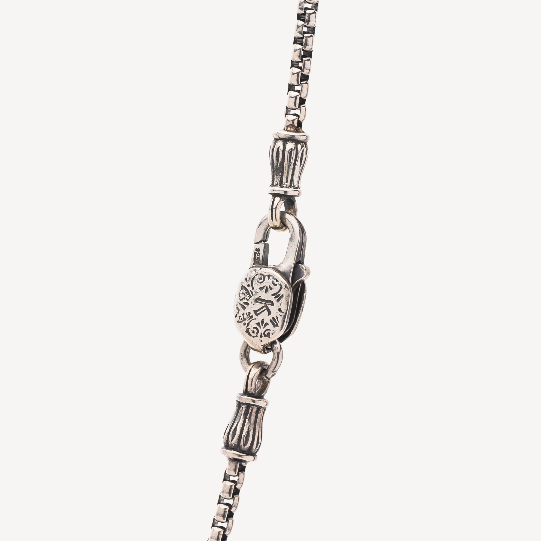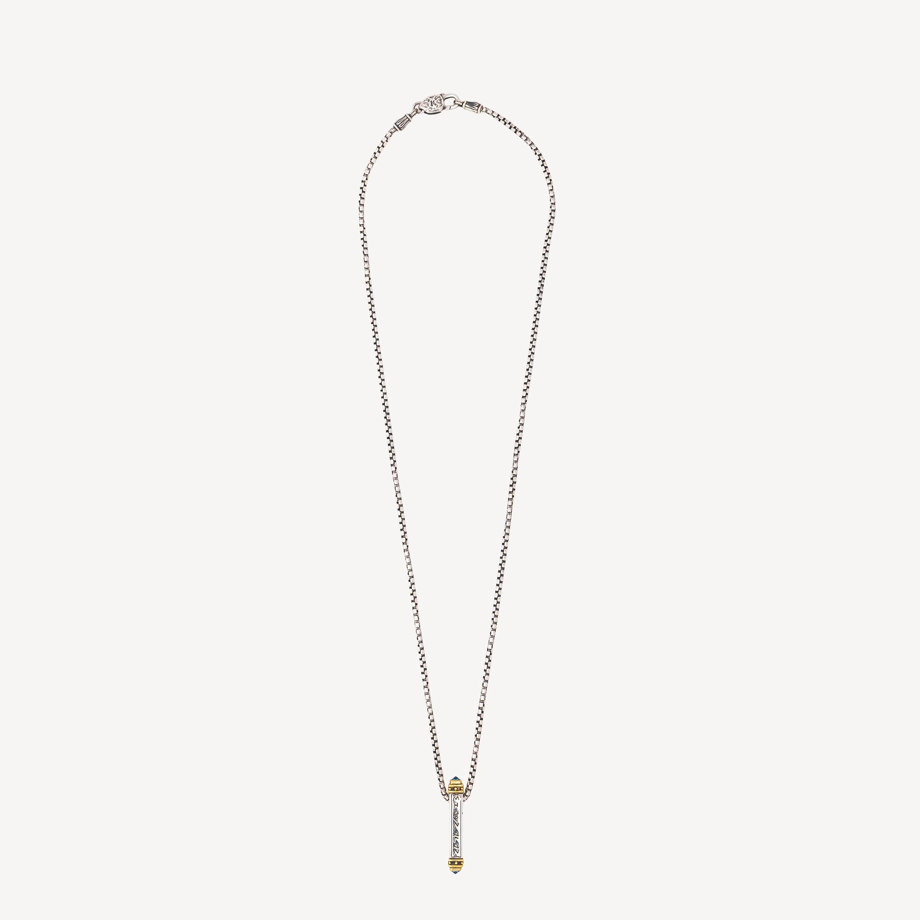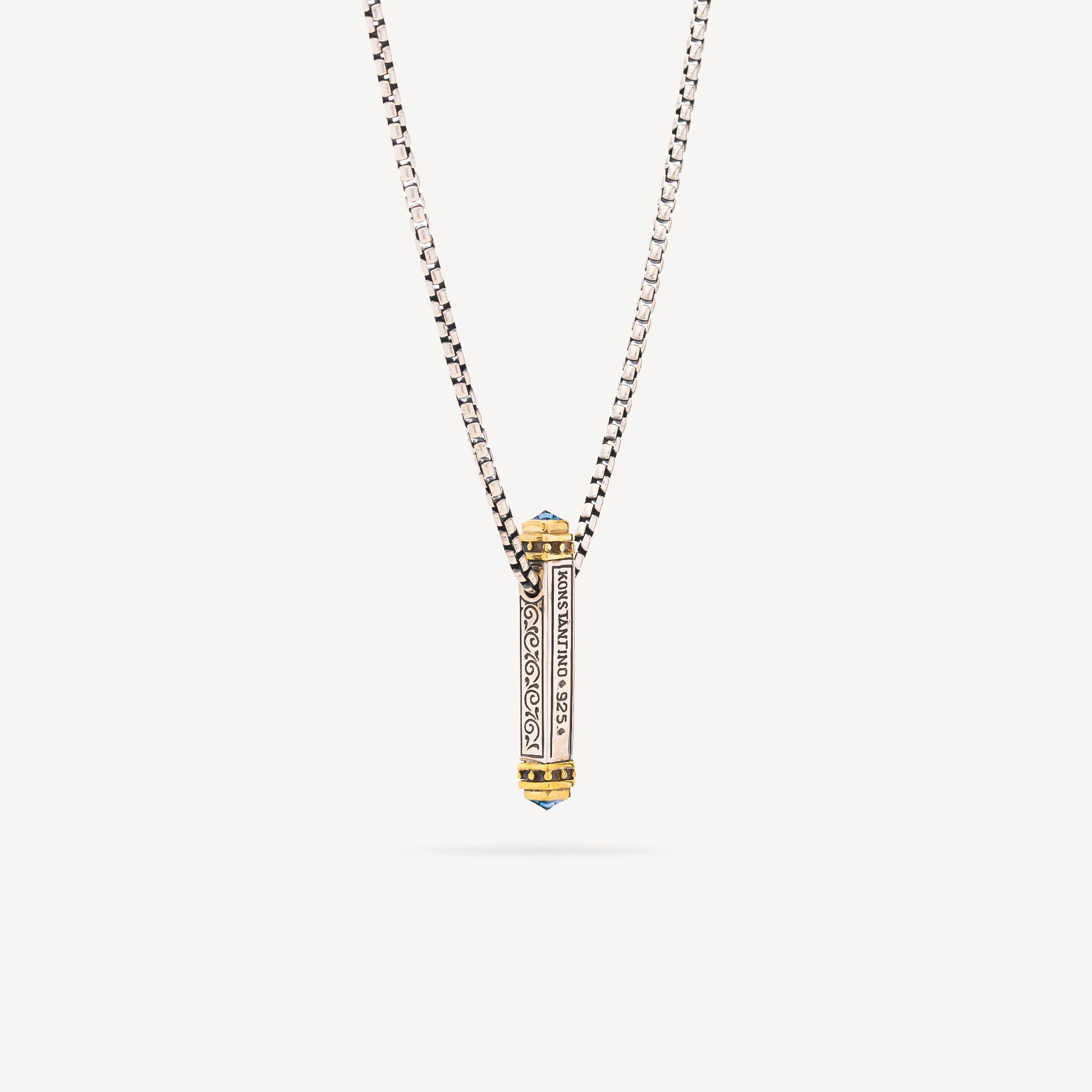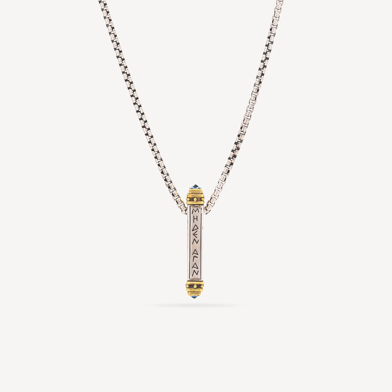 Le collier Kavos Apollo, signé Konstantino, associe de l’argent à la chaleur du bronze dans un pendentif au caractère affirmé. Orné de deux spinelles aux extrémités, il encadre l’inscription grecque « MHDEN ALAN » signifiant « Rien de trop », symbole d’équilibre et de sagesse inspiré de la Grèce antique. Un bijou puissant, mêlant héritage, spiritualité et modernité. La spinelle est réputée pour revitaliser l’énergie, renforcer la détermination et encourager le courage.