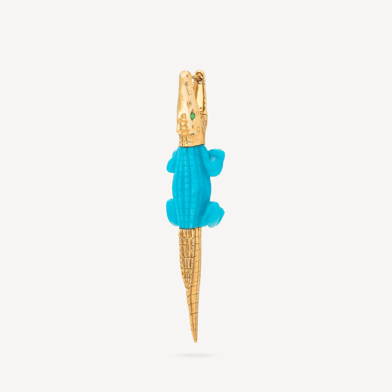 La boucle d’oreille Alligator en turquoise, signée Bibi Van Der Velden, est sculptée et façonnée à la main pour reproduire le corps miniature de l’animal, avec des yeux vifs en tsavorite. Réalisée en or jaune, la bouche de l’alligator sert de mécanisme de fermeture, se fixant délicatement sur l’oreille. Polyvalente, cette pièce unique peut également être portée comme pendentif. La turquoise apporte protection, apaisement et communication sincère.