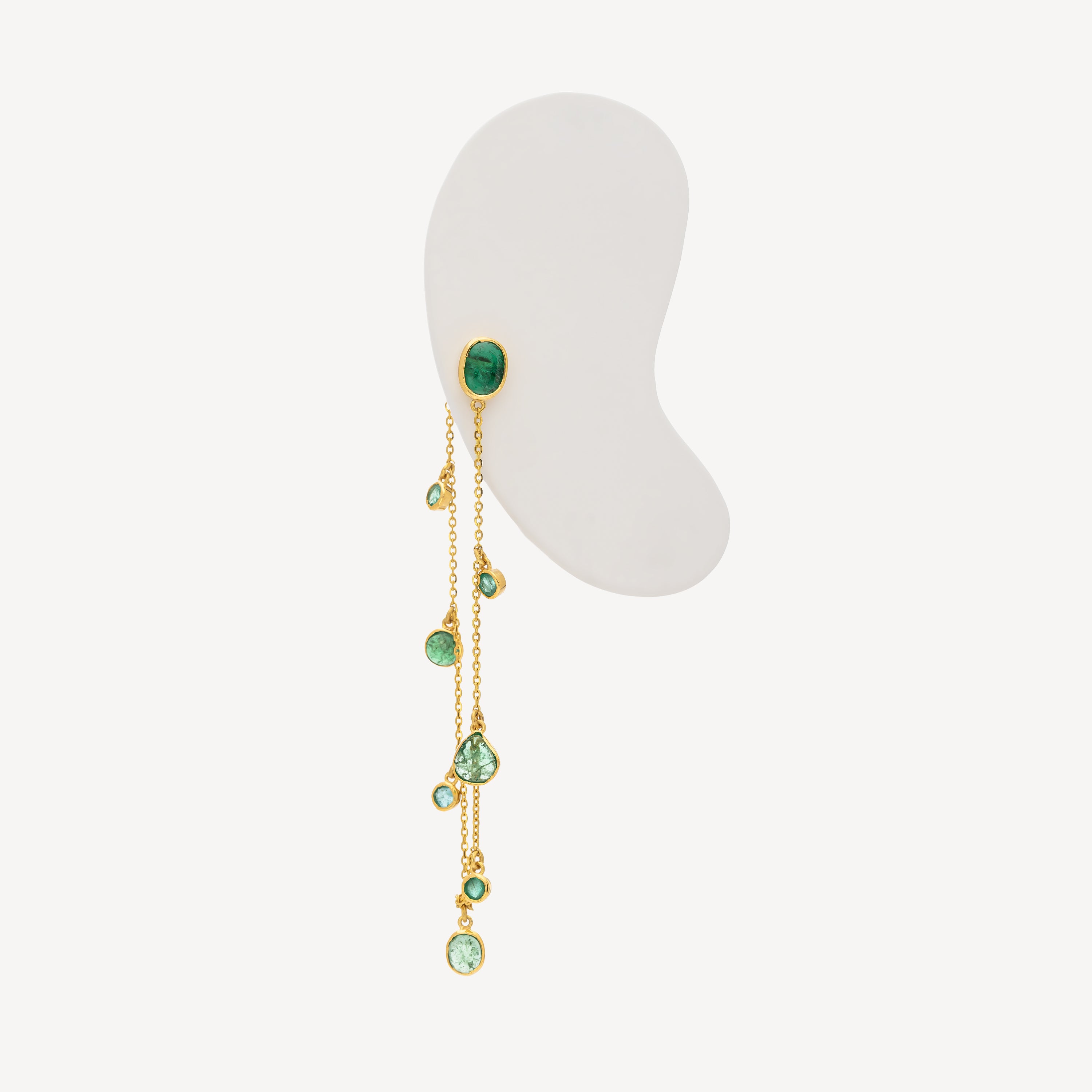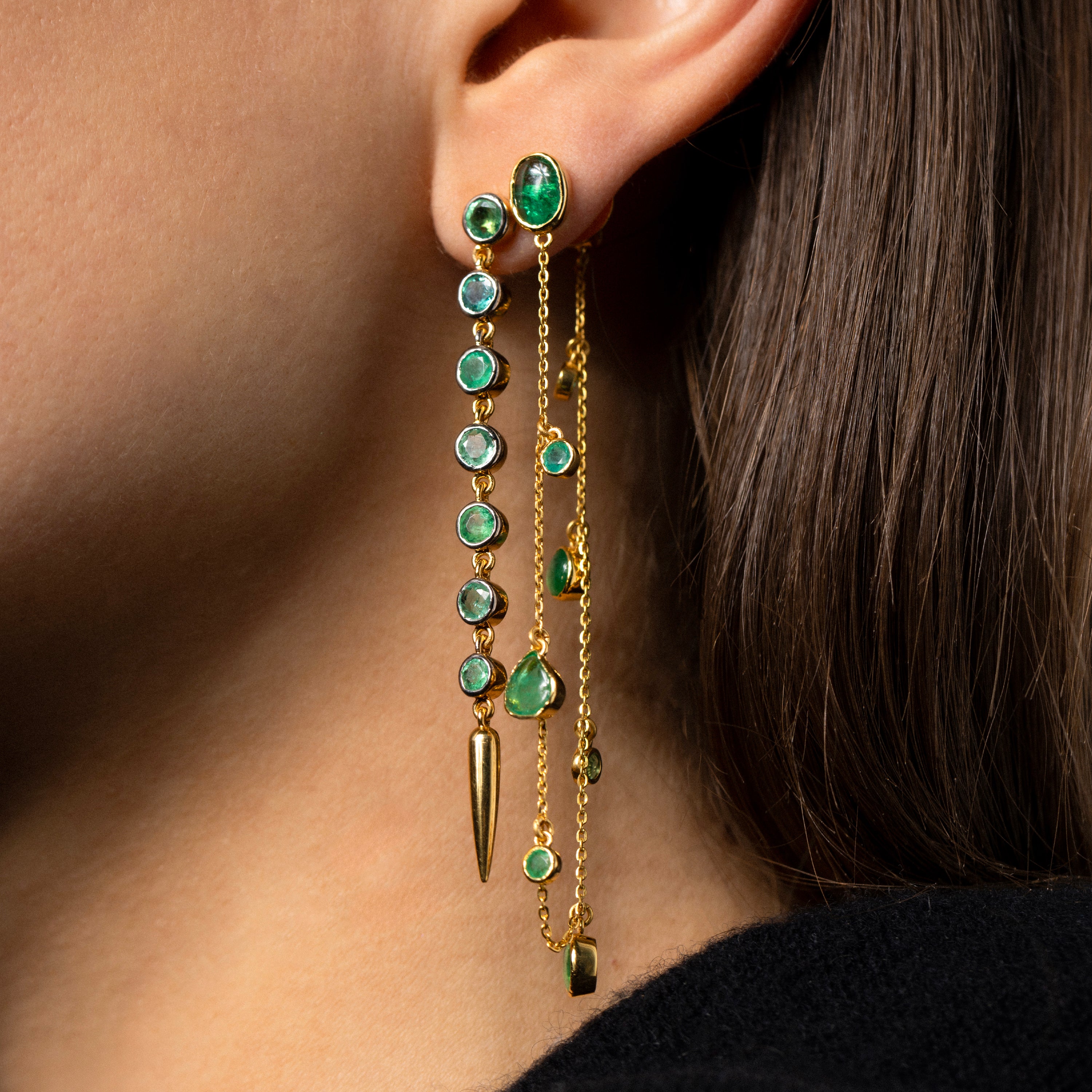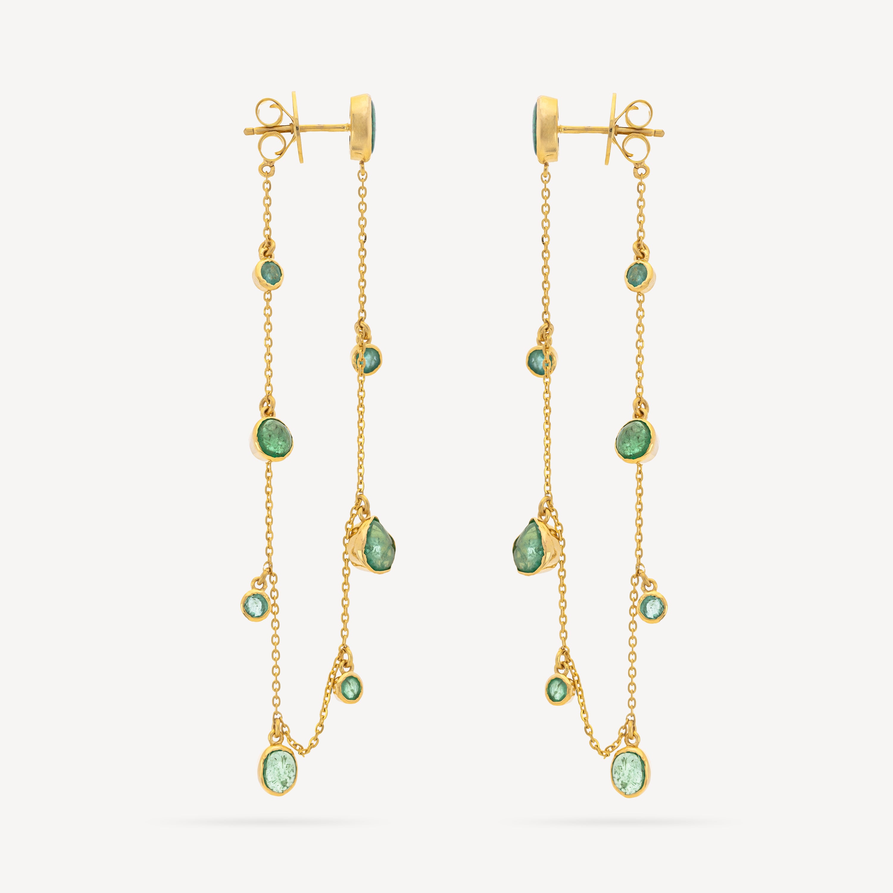 Cette somptueuse paire de boucles d'oreille en or jaune forme une pluie d'émeraude et est montée en serti clos.