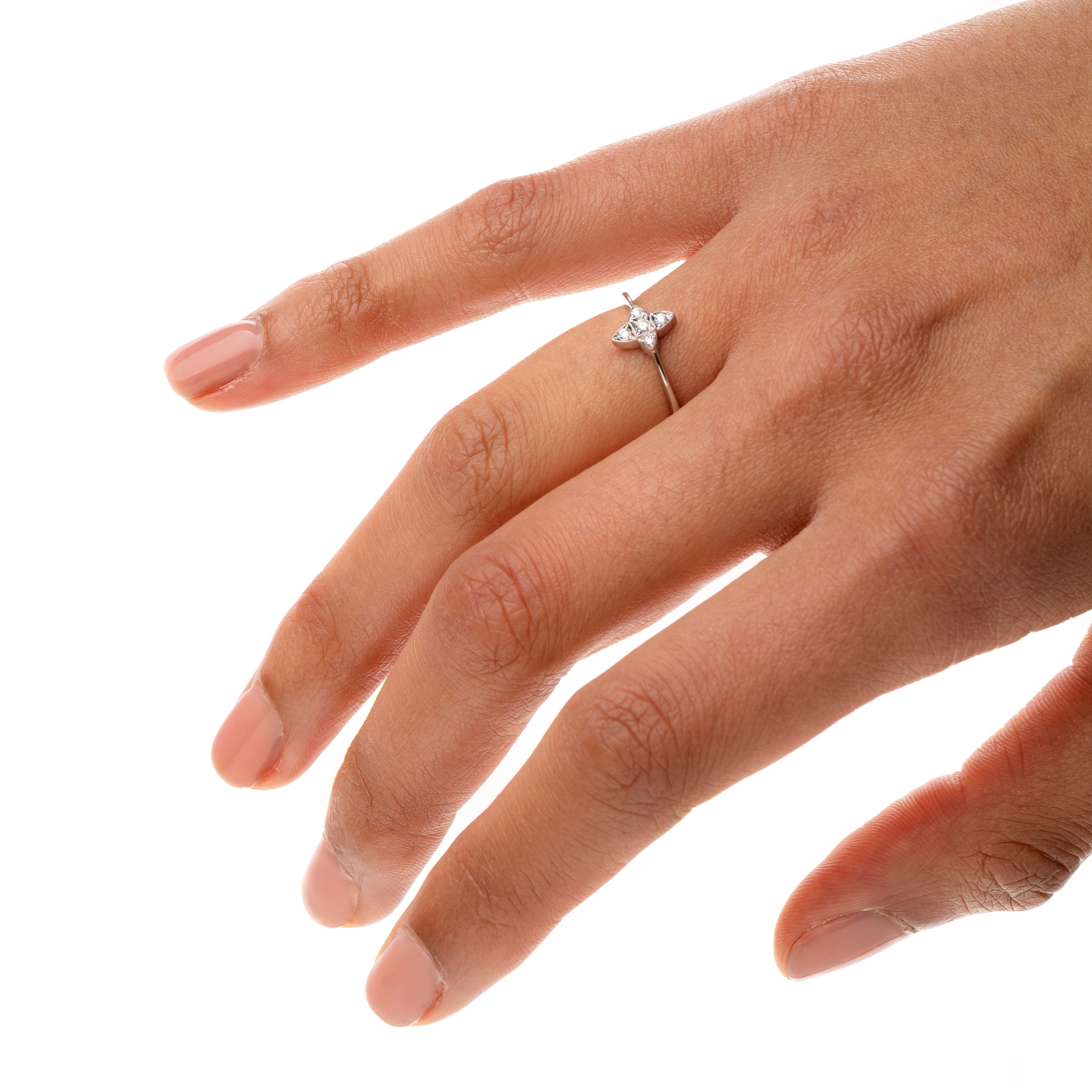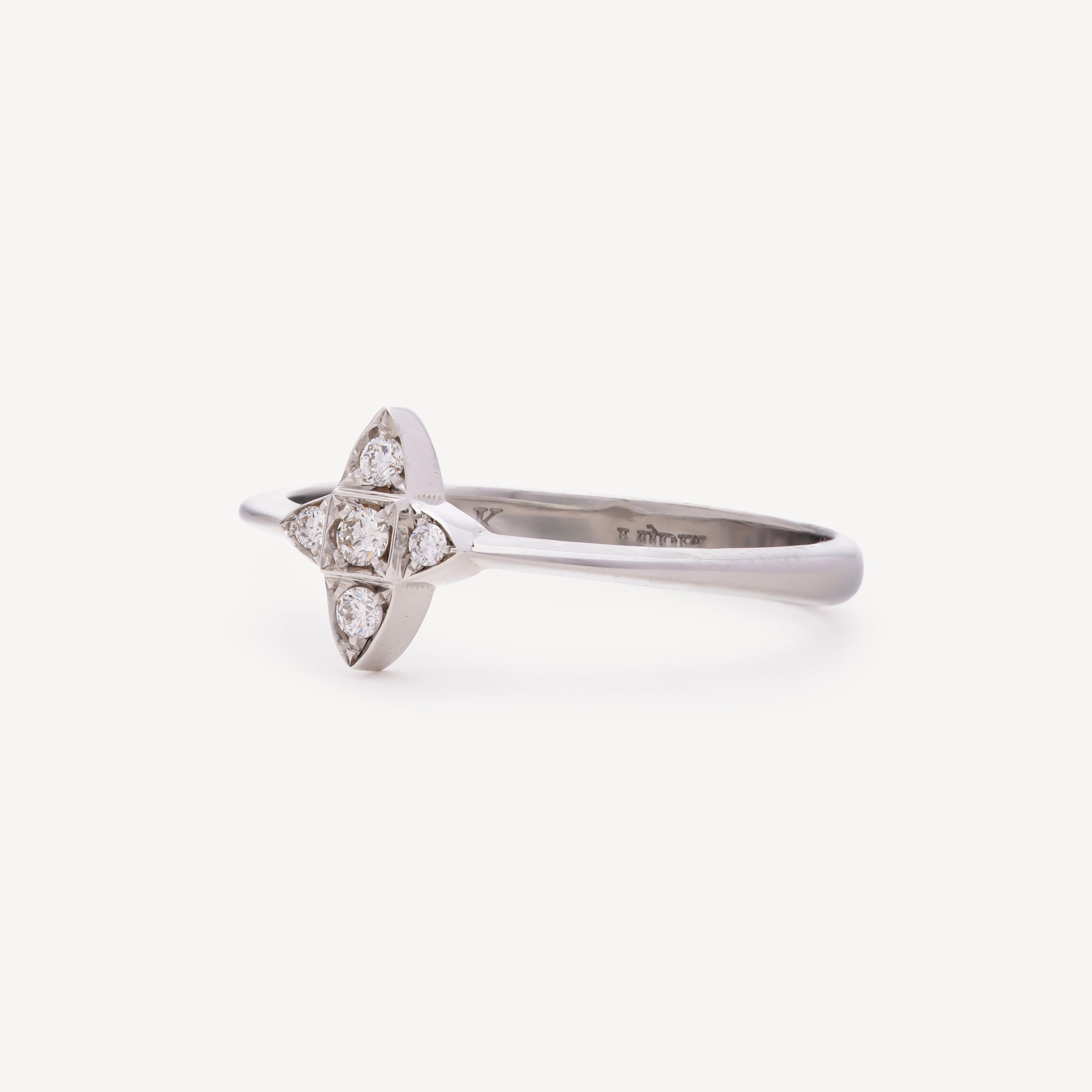 Fabriquée à la main en or blanc 18 carats, la bague Minor Star Crossed présente un anneau en or blanc poli, orné d’un petit motif étoilé en or blanc. Le design est sublimé par le diamant bleu caché, signature de Mìrel, clin d’œil discret au savoir-faire de la maison.