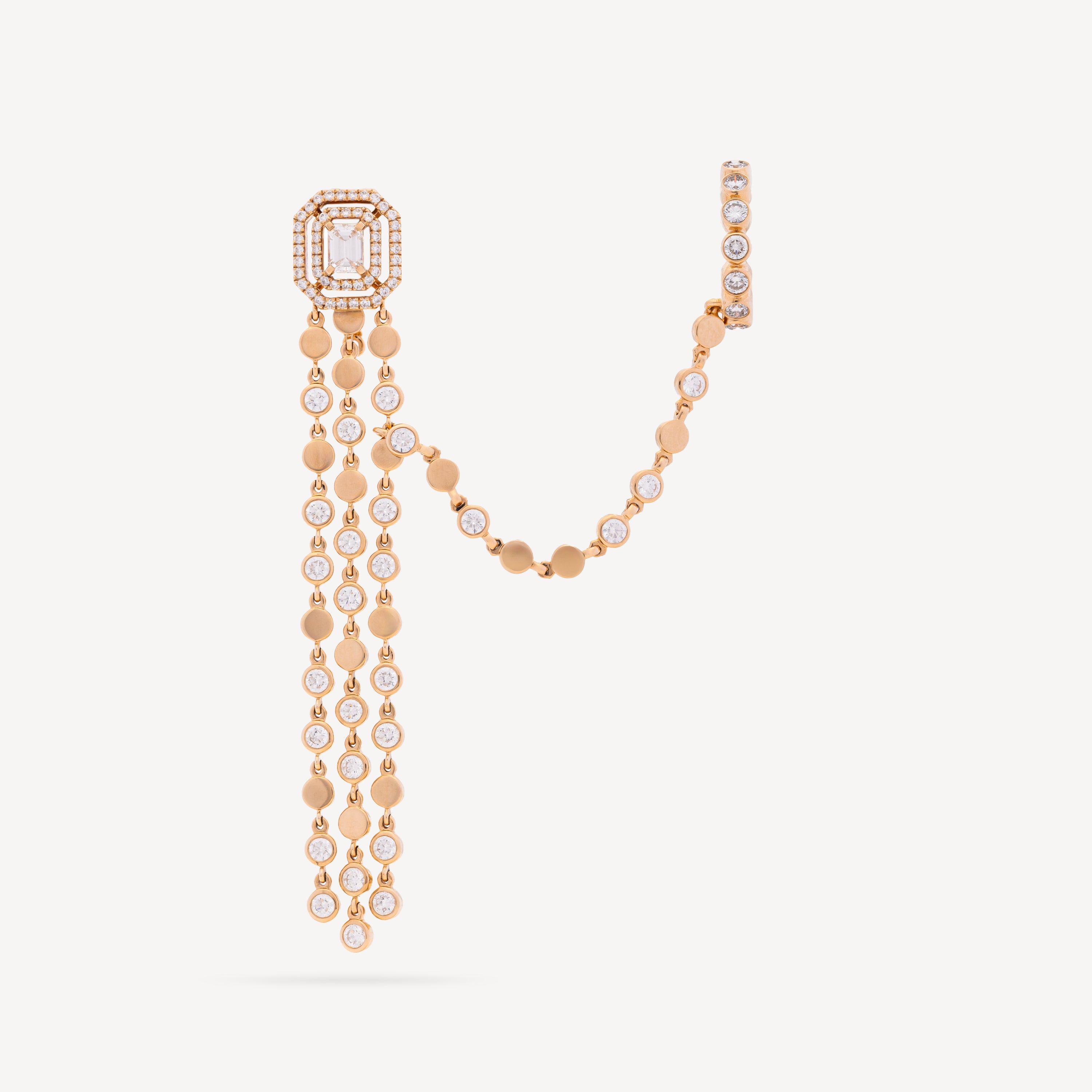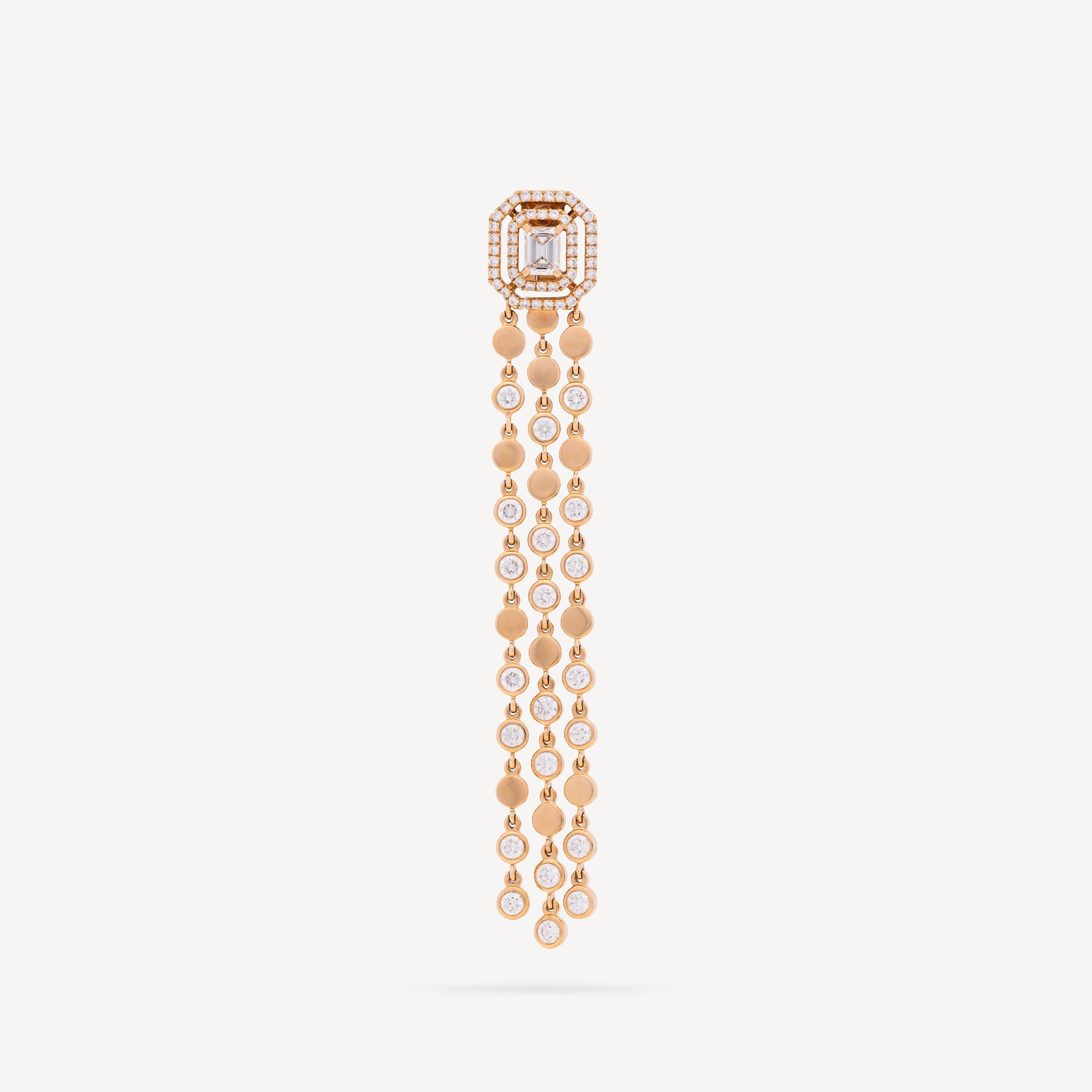 Découvrez les boucles d'oreilles D-Vibes multi-rangs en or rose et diamants ! Réalisées à la main, jouant sur la souplesse de l'emmaillement, elles suivent chacun des mouvements du cou, captant la lumière avec leur pavage diamant ainsi qu'avec les deux diamants taille émeraude de 0,30 carat qui habillent chaque boucle d'oreille.