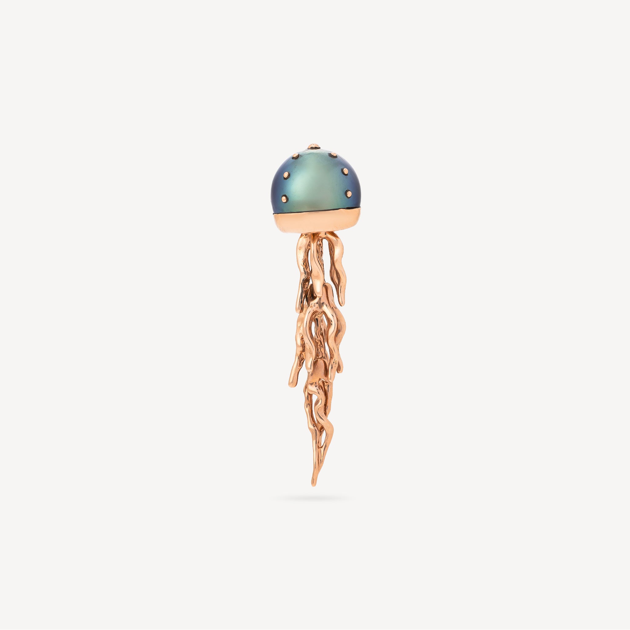 La puce d'oreille Méduse, signée Bibi Van Der Velden, met en valeur une perle de Tahiti formant la cloche de la méduse, sertie en or rose. Ses tentacules finement travaillées s’étendent avec grâce, évoquant le mouvement fluide de cette créature marine. La perle de Tahiti incarne la sagesse, tout en favorisant l’harmonie intérieure.