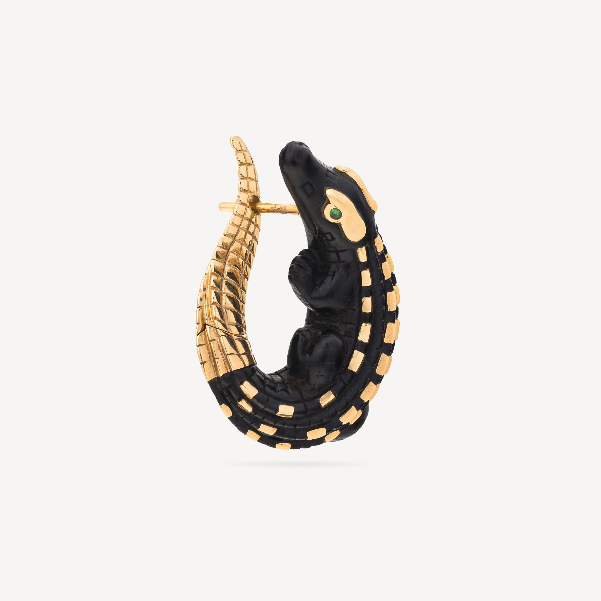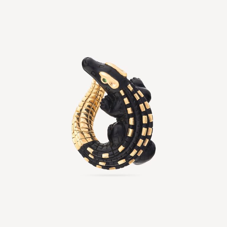 La boucle d’oreille Alligator Twist signée Bibi Van Der Velden revisite le design emblématique de la maison dans une version plus compacte. Réalisée en bois d’ébène, elle met en valeur les détails du motif alligator, dont le corps est ponctué d’écailles en or jaune, créant un contraste marqué avec la teinte sombre du bois. La tsavorite stimule la vitalité, attire la prospérité et favorise la croissance personnelle.