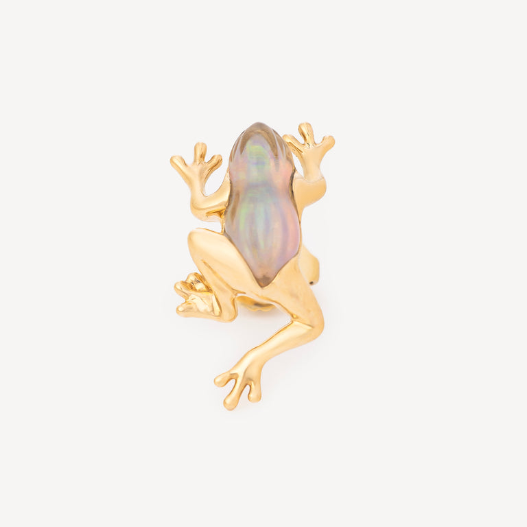 Cette puce d'oreille Grenouille porte-bonheur, signée Bibi Van Der Velden, est réalisée en or jaune, alliant charme symbolique et savoir-faire. La pièce met en valeur de l'opale irisée fascinante. Symbole de transformation, renouveau et chance, la grenouille apporte une énergie positive à ce design espiègle. L’opale éveille la créativité, amplifie les émotions positives et favorise la connexion avec l’intuition et les rêves.