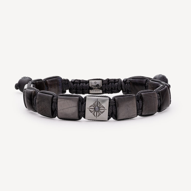 Bracelet monté sur un cordon noir composé de : un lock en or noir orné d’un diamant noir, un lock en or noir orné de diamants noirs, 12 locks en saphir gris et 2 beads en céramique noire.