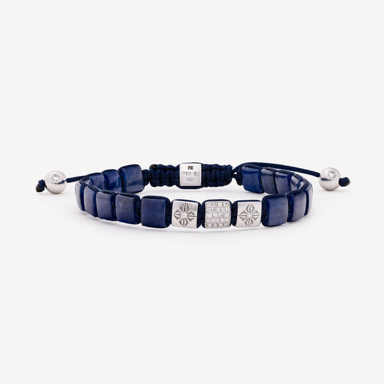 Bracelet monté sur un cordon bleu nuit composé de : 17 locks en saphir bleu, 2 locks en or blanc ornés de diamants blancs, un lock en or blanc pavé de diamants blancs, un lock en or blanc orné d’un diamant blanc et 2 beads ornées de diamants blancs.