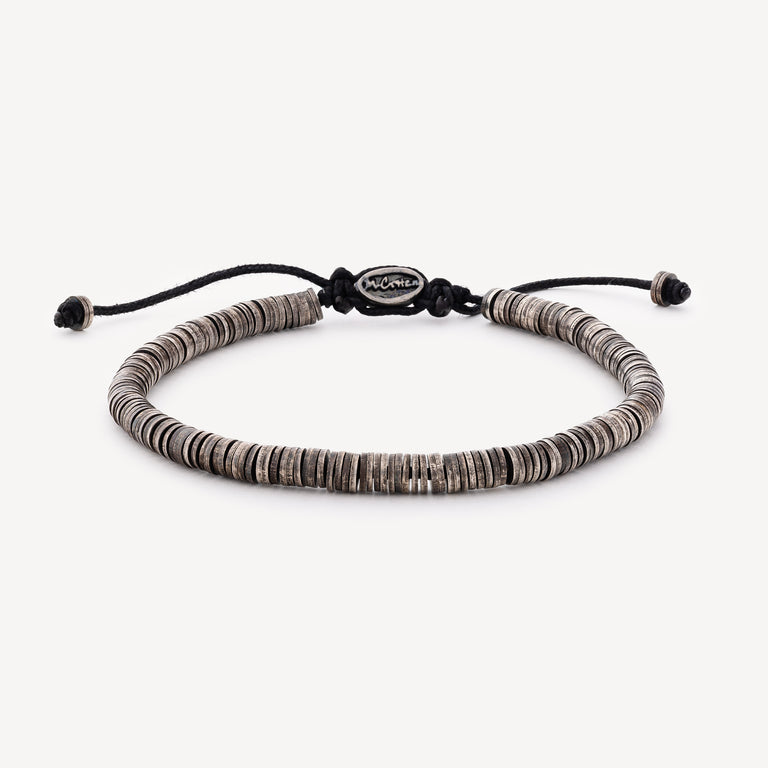 Bracelet monté sur un cordon noir composé de disques en argent oxydé.