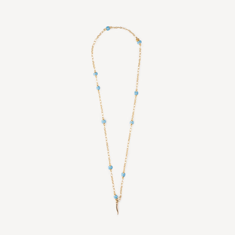 Collier chaîne or rose arboré de perles bleues en céramique et d’un pendentif en forme de piment.