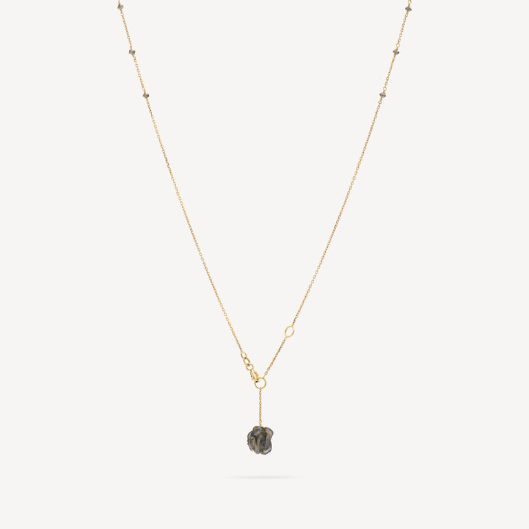 Collier en or jaune orné de quinze diamants bruns et d’une fleur pendante en labradorite au niveau du fermoir.