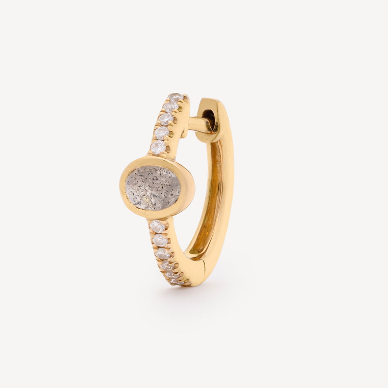Créole en or jaune pavée de diamants et ornée d’une labradorite centrale.