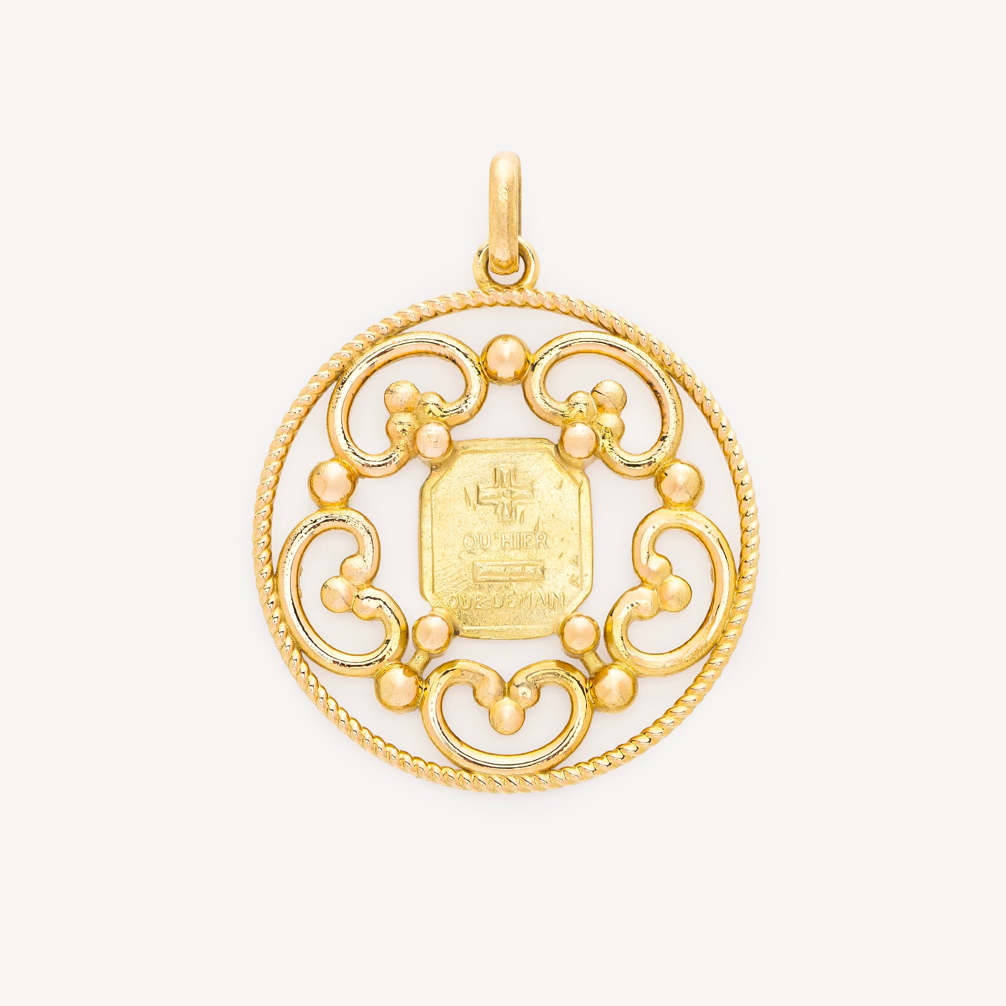 Médaille d’amour vintage en or jaune composée d’une plaque centrale ornée de l’inscription “+ qu’hier - mois que demain”.
