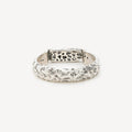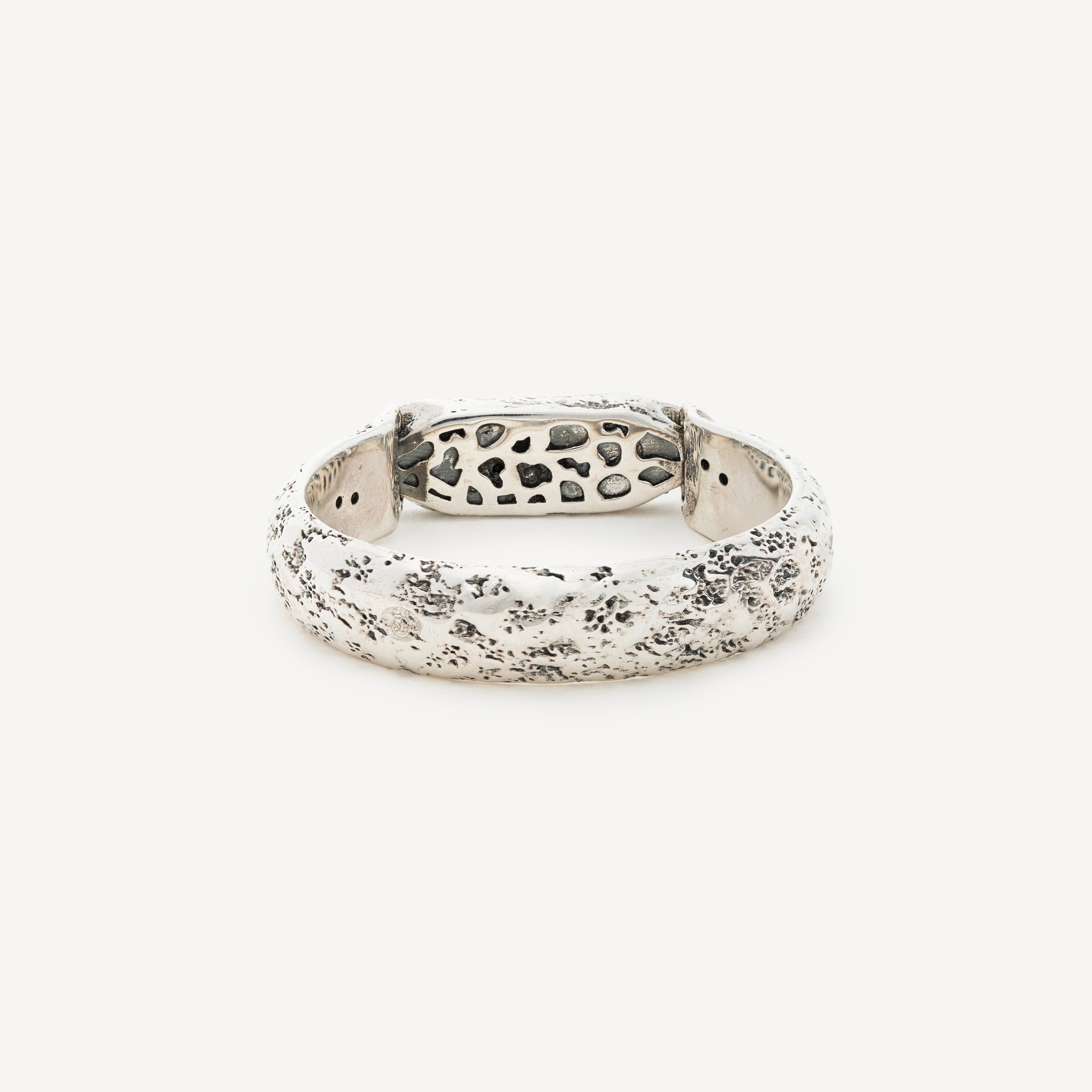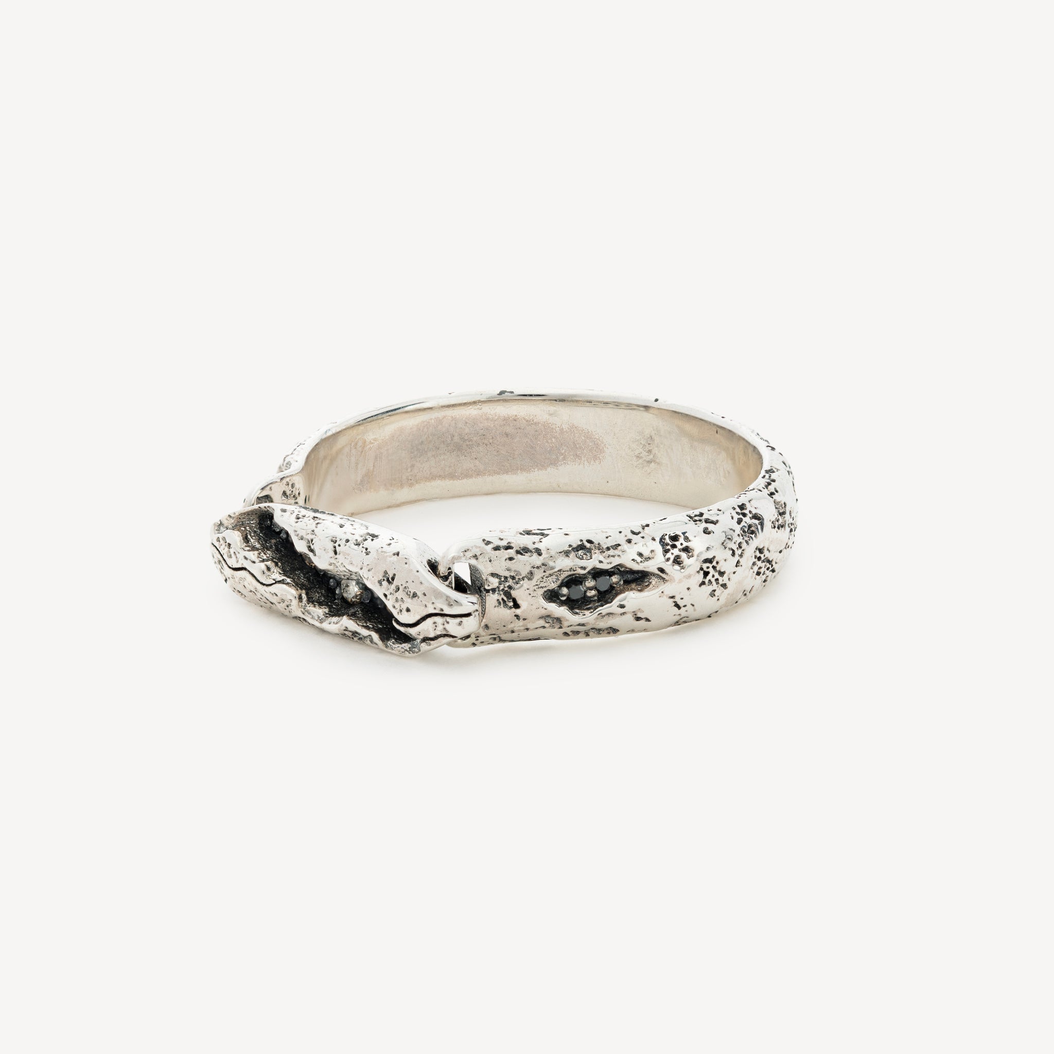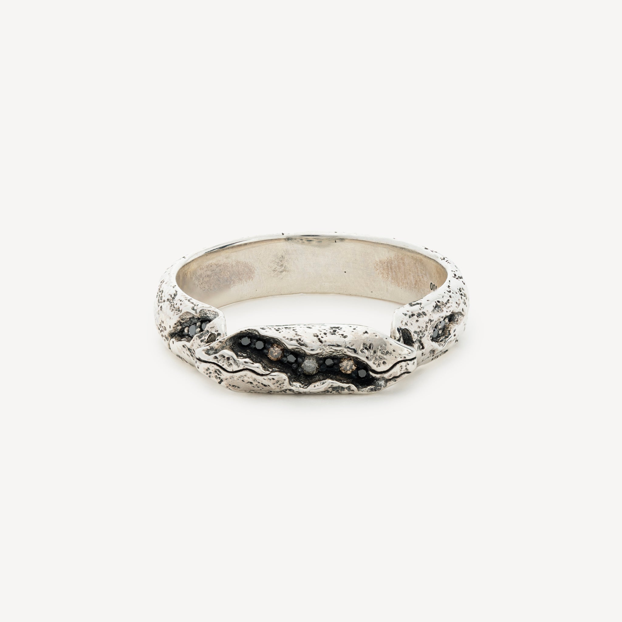 La bague Chasm Station de Carina Hardy en argent recyclé se distingue par une surface fracturée qui surélève élégamment la monture, révélant au sommet un sillon où scintillent des diamants noirs et bruns. L’envers présente un motif organique délicat. Façonnée à la main à Bali et sertie à Bangkok, elle allie savoir-faire artisanal et matériaux rares. Symbole de pureté et de puissance, le diamant est réputé pour clarifier l’esprit.