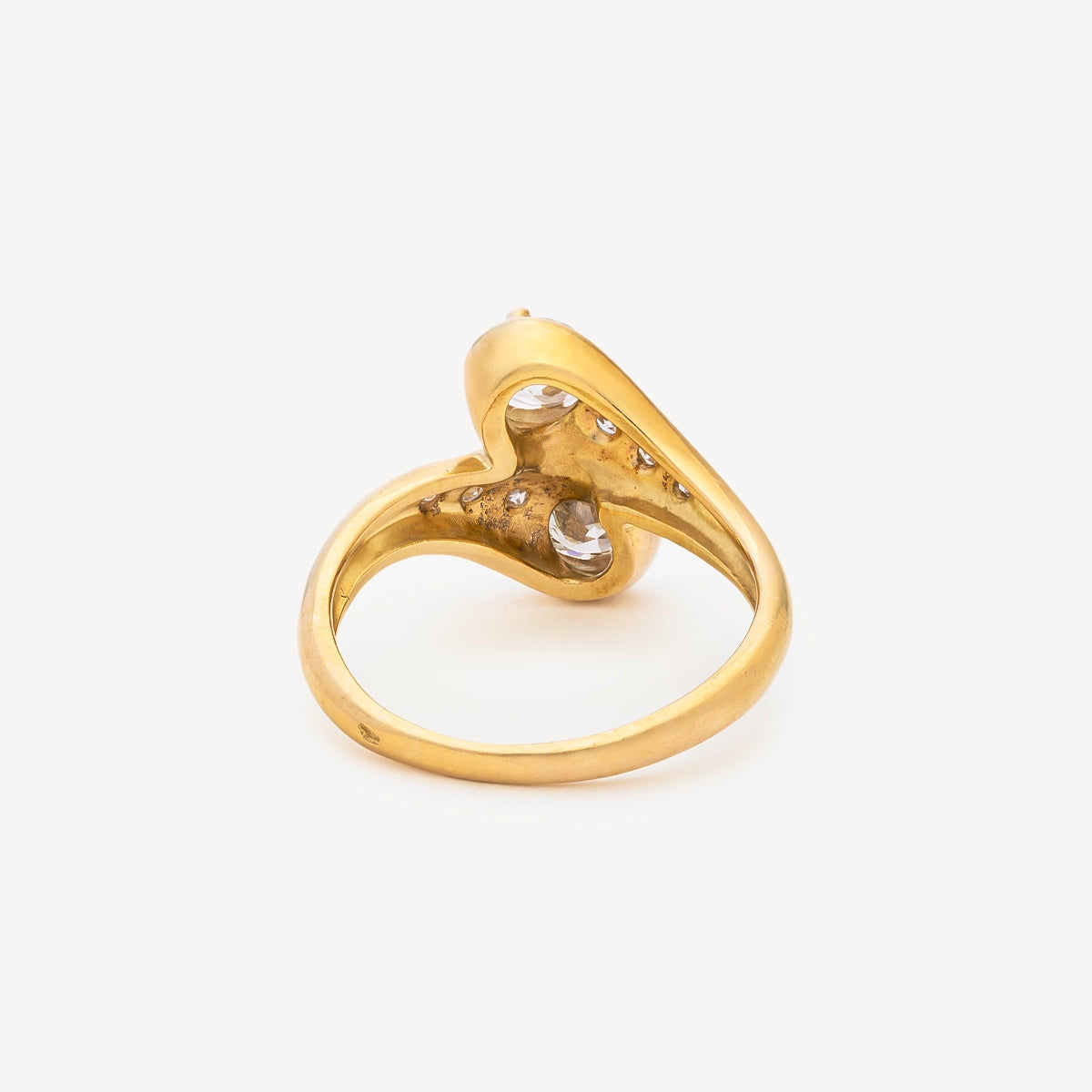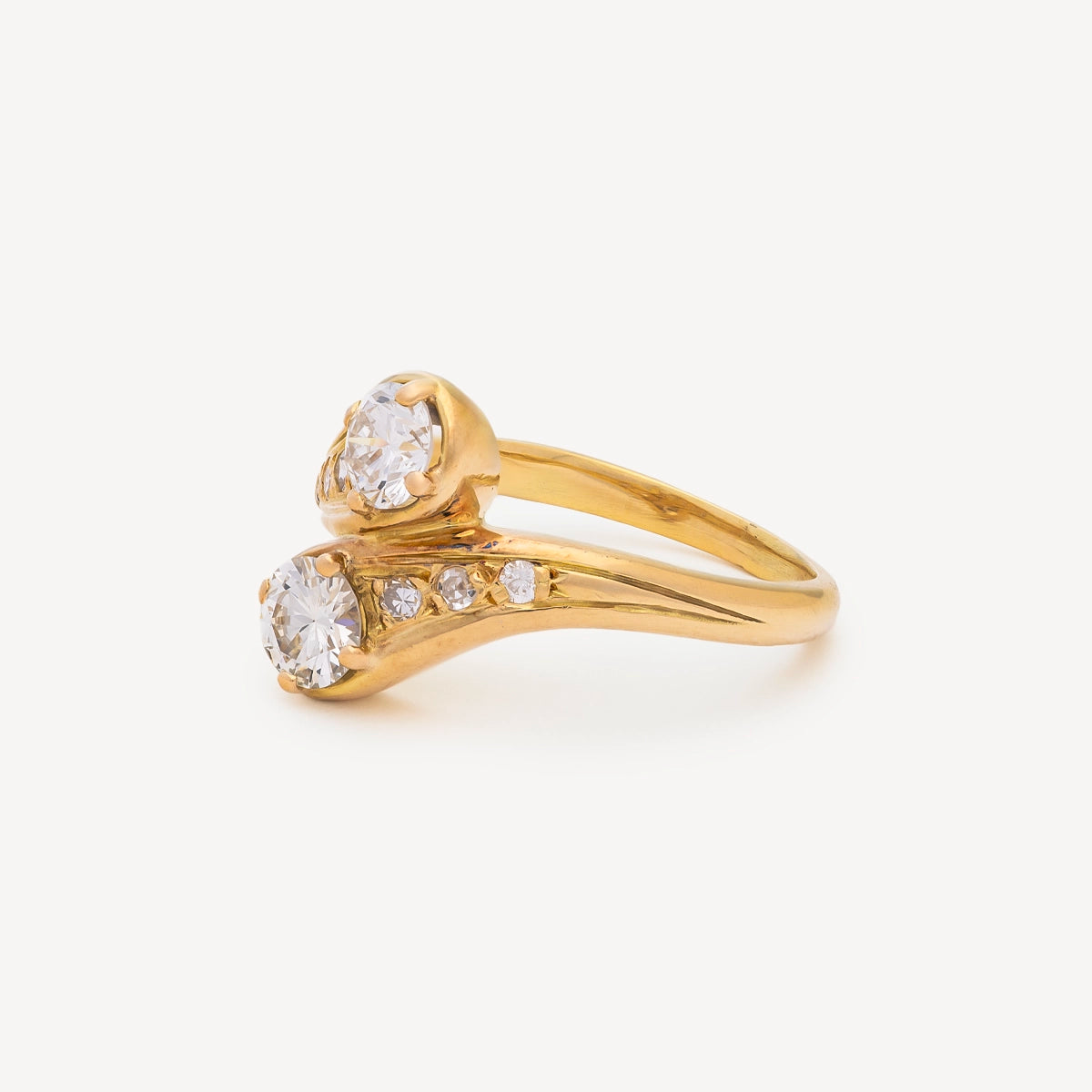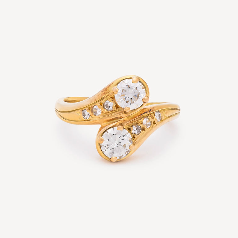 Bague vintage en or jaune ornée de 8 diamants blancs, dont deux forment un double solitaire. Le diamant blanc est réputé pour son énergie de pureté et de lumière, favorisant la clarté mentale, la force intérieure et l'alignement spirituel.