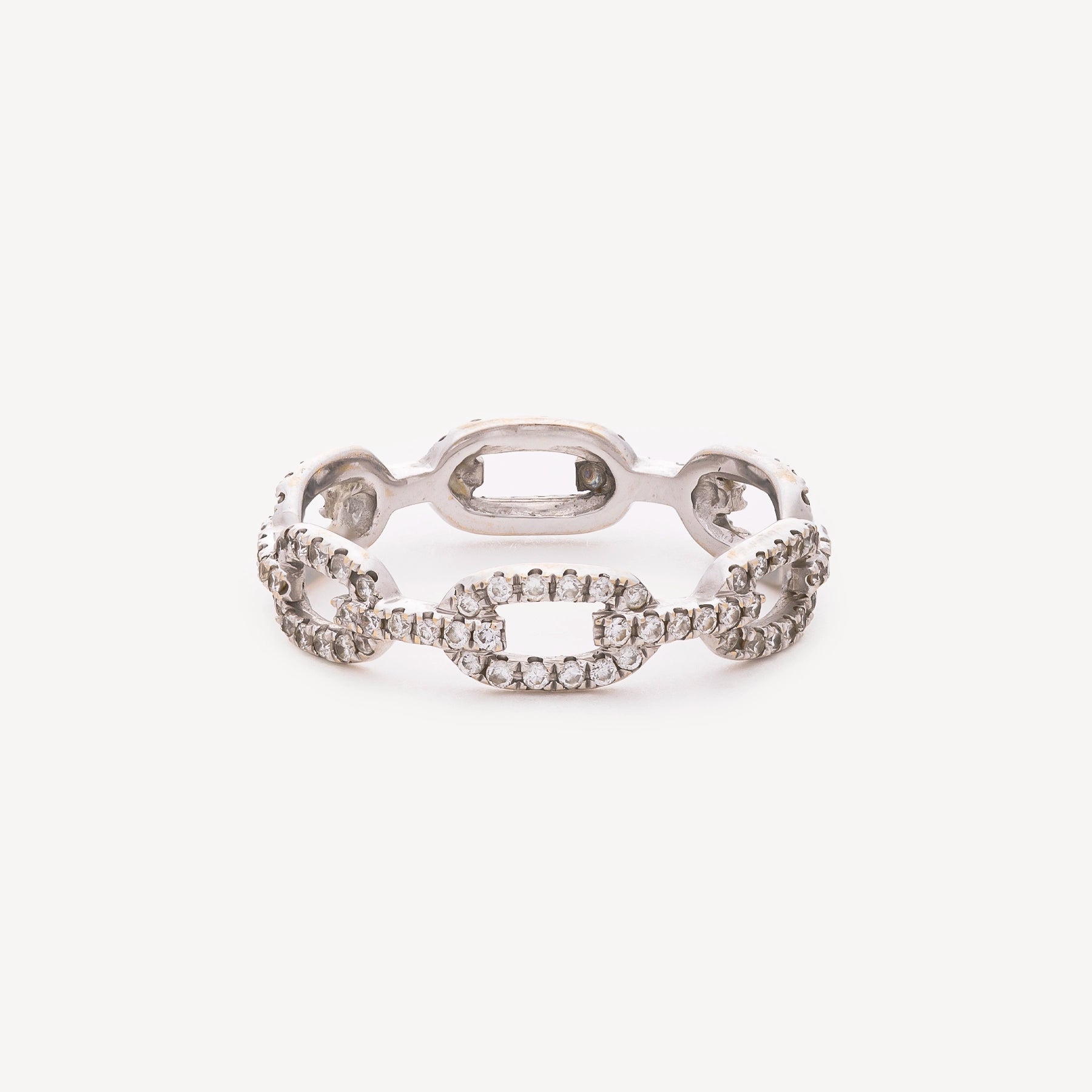 La bague Enchaînée de Machalka, façonnée en or blanc et pavée de diamants blancs, allie élégance et symbolisme. Son motif de chaîne emblématique en fait une alliance idéale ou un bijou fétiche à porter au quotidien.