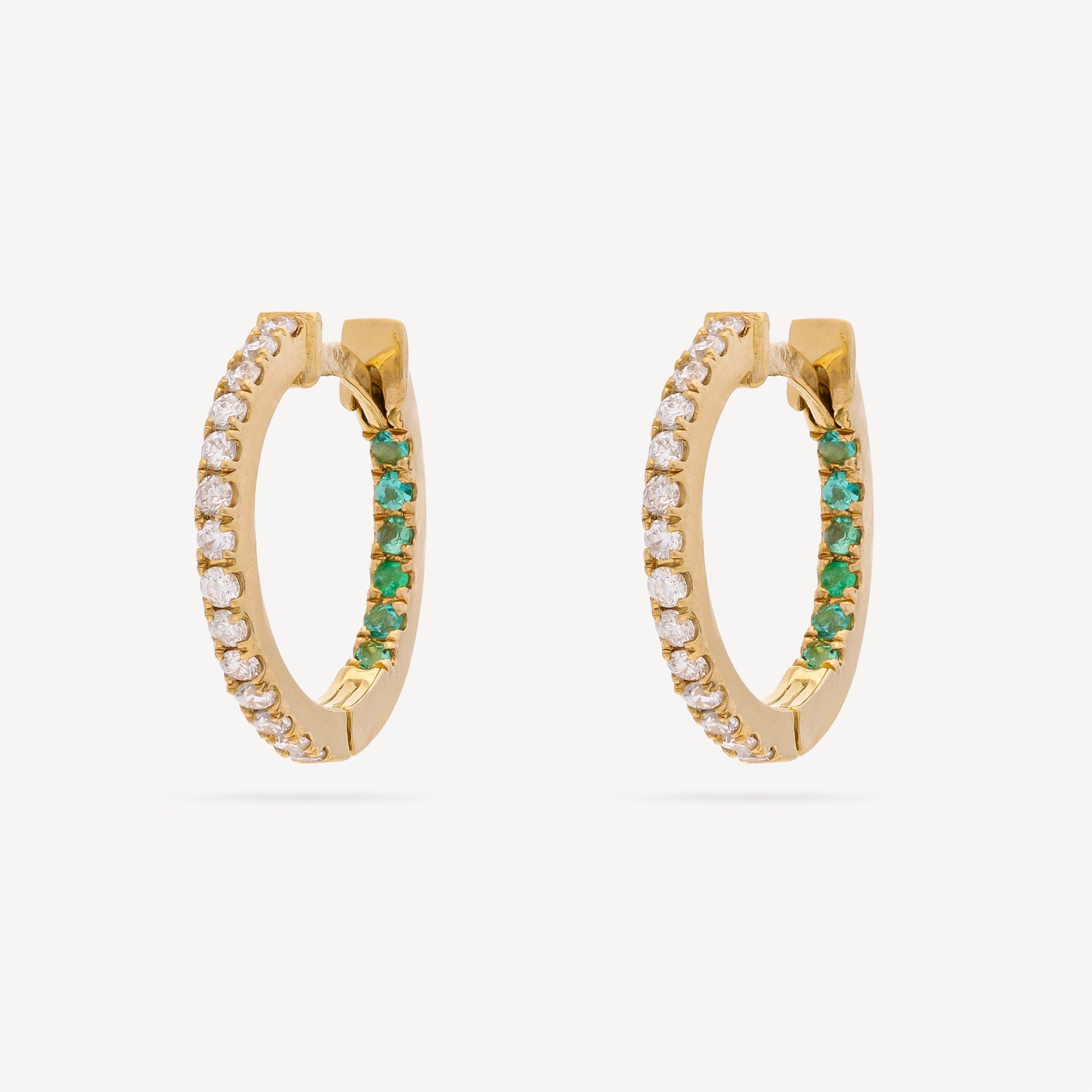 Ces créoles huggie en or jaune sont serties de diamants blancs étincelants et d’émeraudes vibrantes. Le diamant blanc incarne la pureté et la force intérieure, tandis que l’émeraude favorise l’harmonie du cœur et l’équilibre émotionnel.