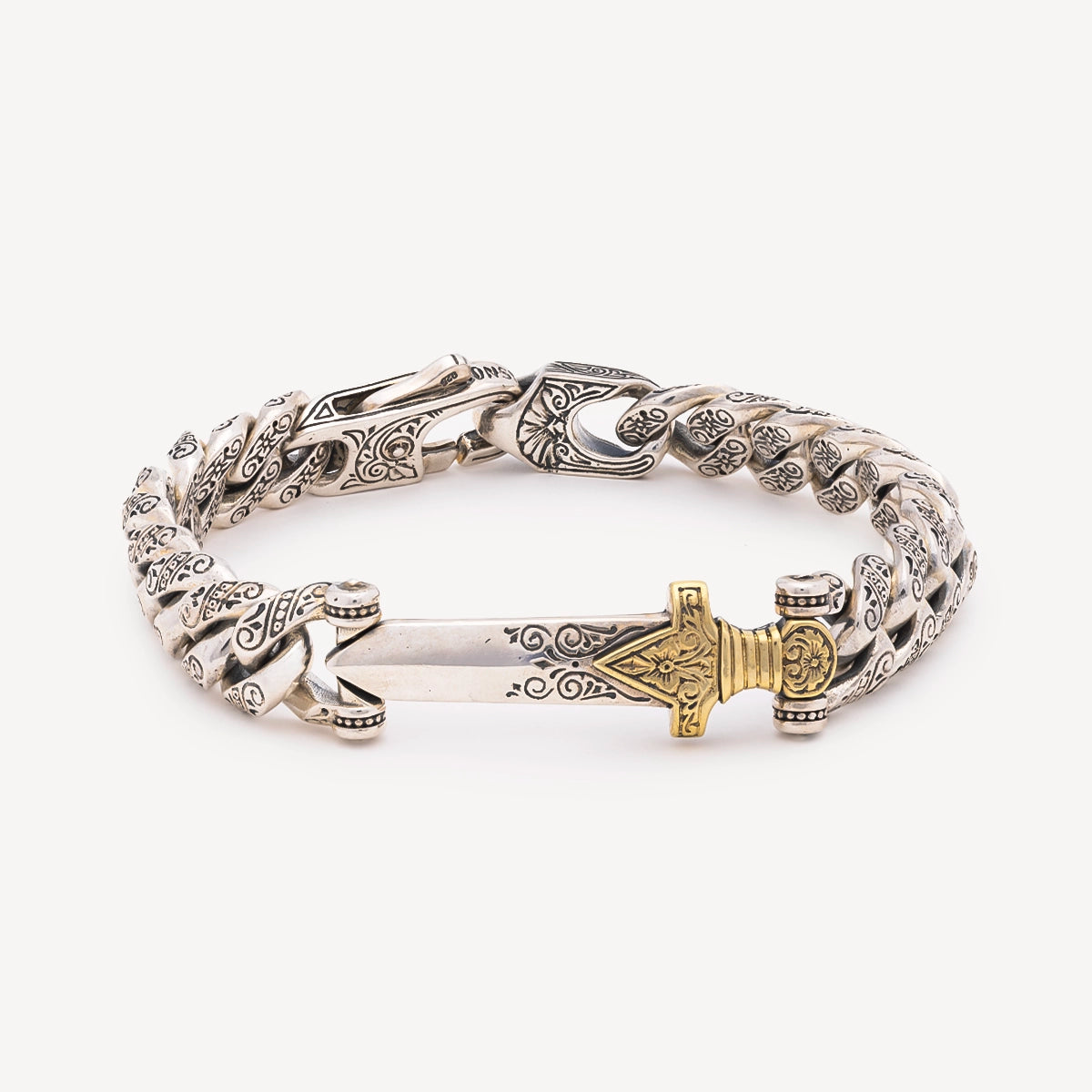 Le Bracelet Seafarer Kavos en argent et bronze se distingue par une présence affirmée au poignet, ponctuée en son centre d’une épée sculptée, symbole de force et de détermination. Chaque maillon est travaillé à la main en Grèce, mêlant robustesse et finesse du détail, pour un bijou qui capte la lumière et impose son caractère. Un équilibre parfait entre puissance visuelle et maîtrise artisanale.