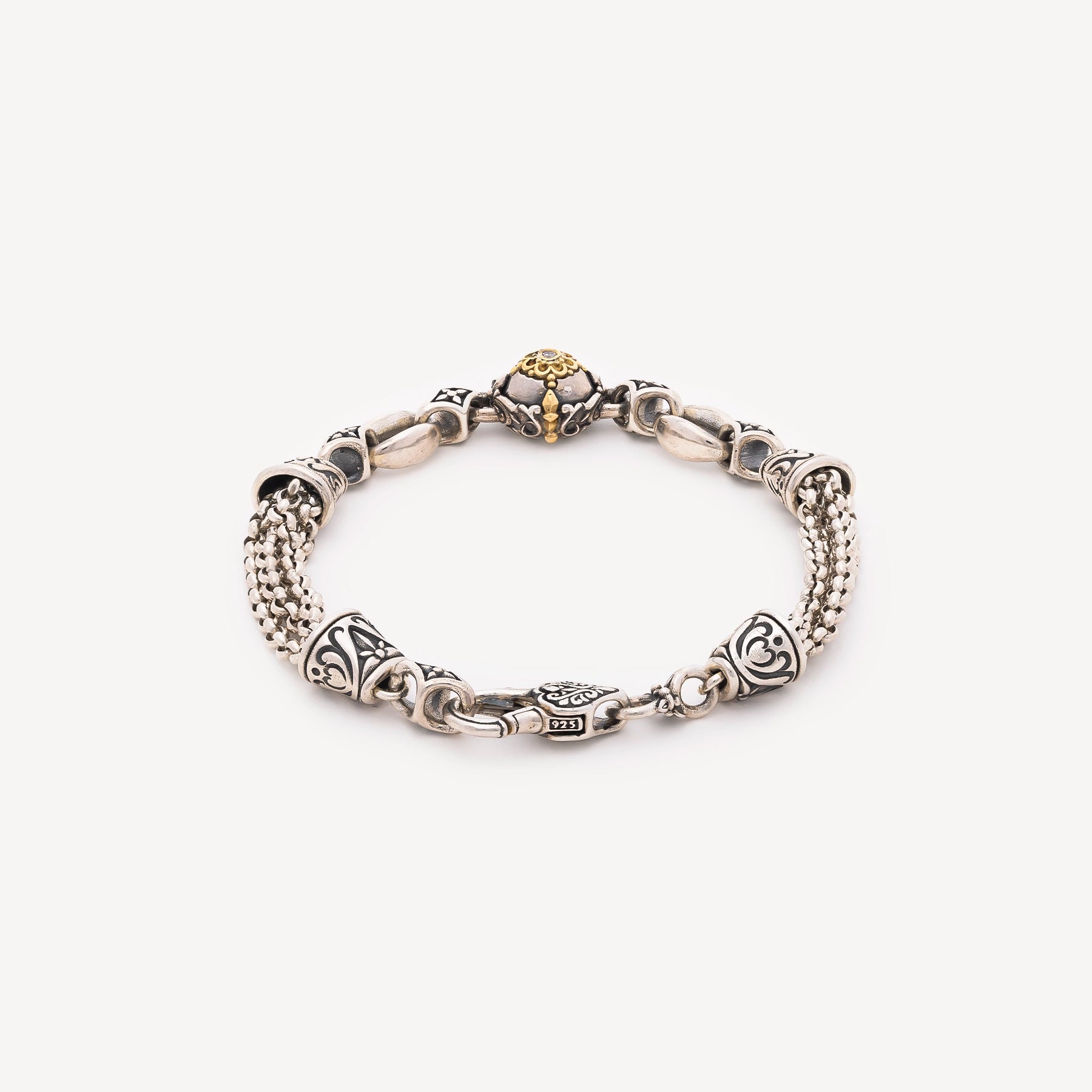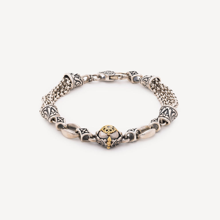 Le bracelet Amazona Diamant, Argent et Or Jaune, signé Konstantino, associe l’éclat de l’argent et la chaleur de l’or jaune à un motif central orné d’un unique diamant blanc. Ce détail central illumine le bracelet, offrant un bijou moderne. Le diamant blanc est réputé pour renforcer la clarté d’esprit, la force intérieure et la protection énergétique.